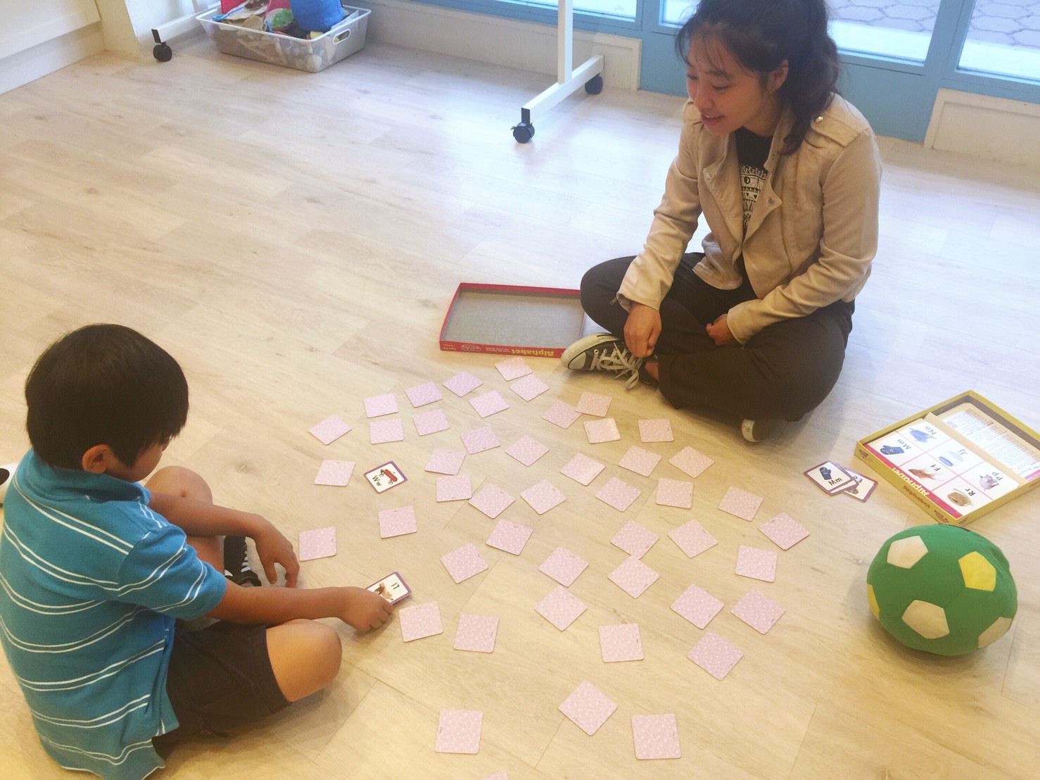 キッズパスポートに来てから、宿題がなかったり終わった生徒さんは、レベルに分かれて基礎レッスン。ビギナー生徒さんたちは、アルファベットの練習。読んだり、書いたり、神経衰弱をしたり。