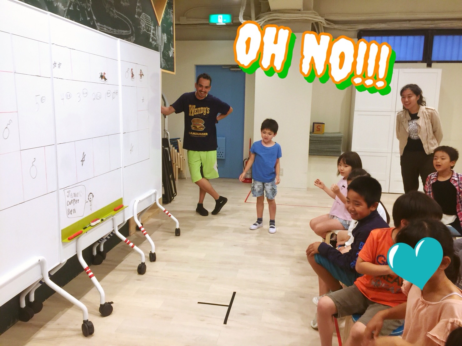 先輩生徒さんたちは、先生の発音を聞いてその綴りを当てるフォニックスのゲームを行いました。
