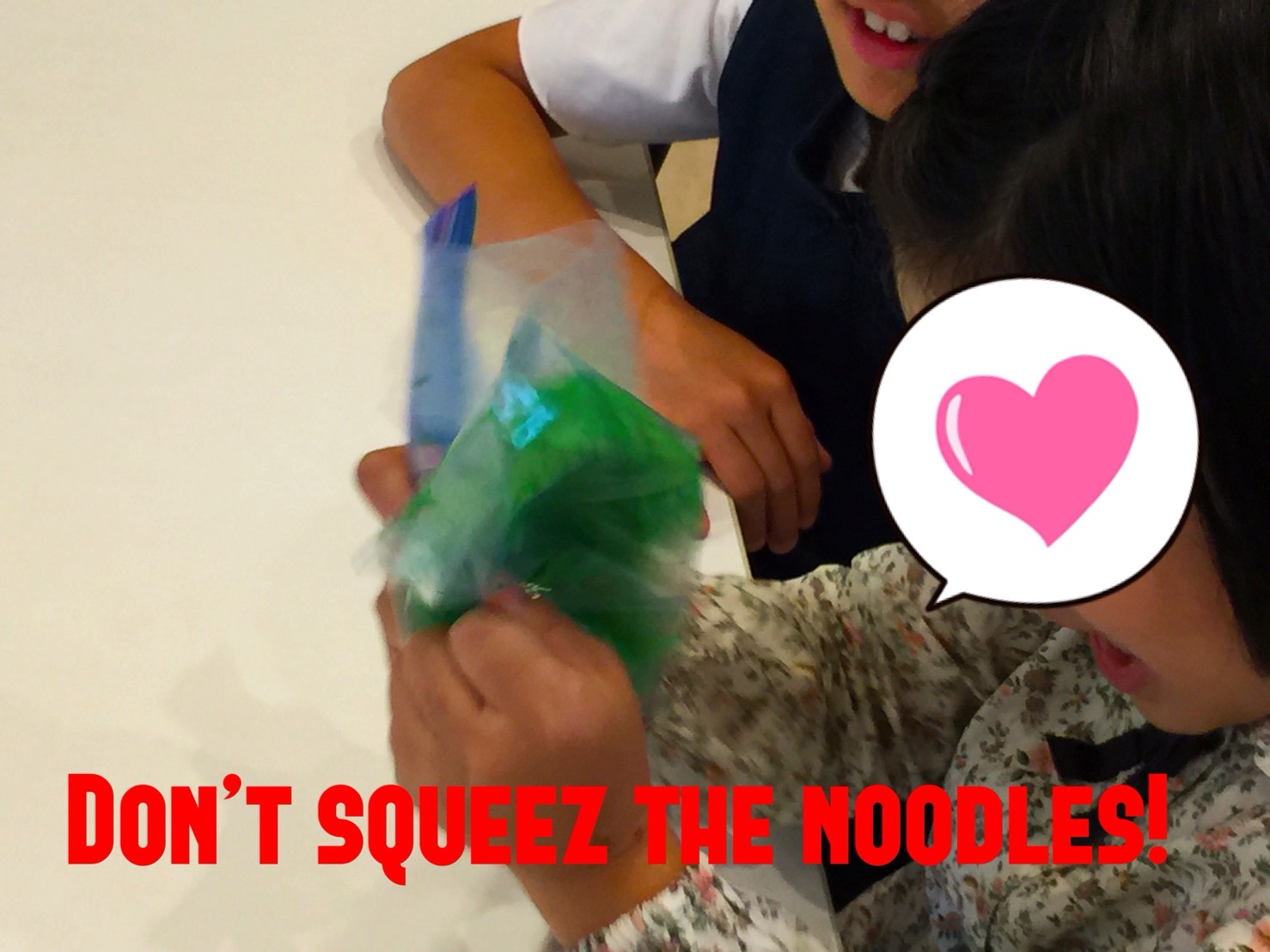 “Don’t squeeze the noodles.”(麺をつぶさないようにね)