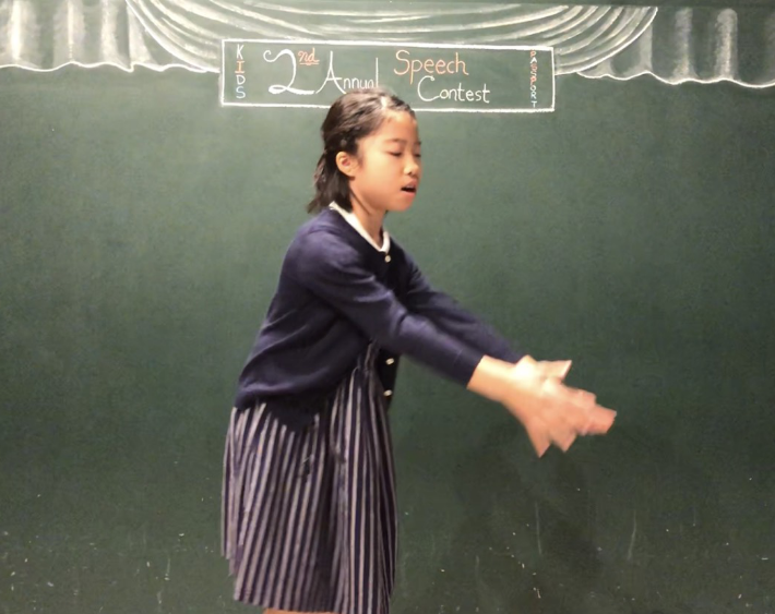 スピーチコンテストでは、優勝者を選ぶにあたっていろいろな部分を見ました。みんなが素晴らしいスピーチを見せてくれたのでなおさら!今回のスピーチコンテストの優勝者は、高いレベルでの口述力(語彙の正しい発音、安定したペース、イントネーション、声のボリュームを含む)の他に、ストーリーにそれぞれのキャラクターを加えて見せてくれた生徒さん達となりました。