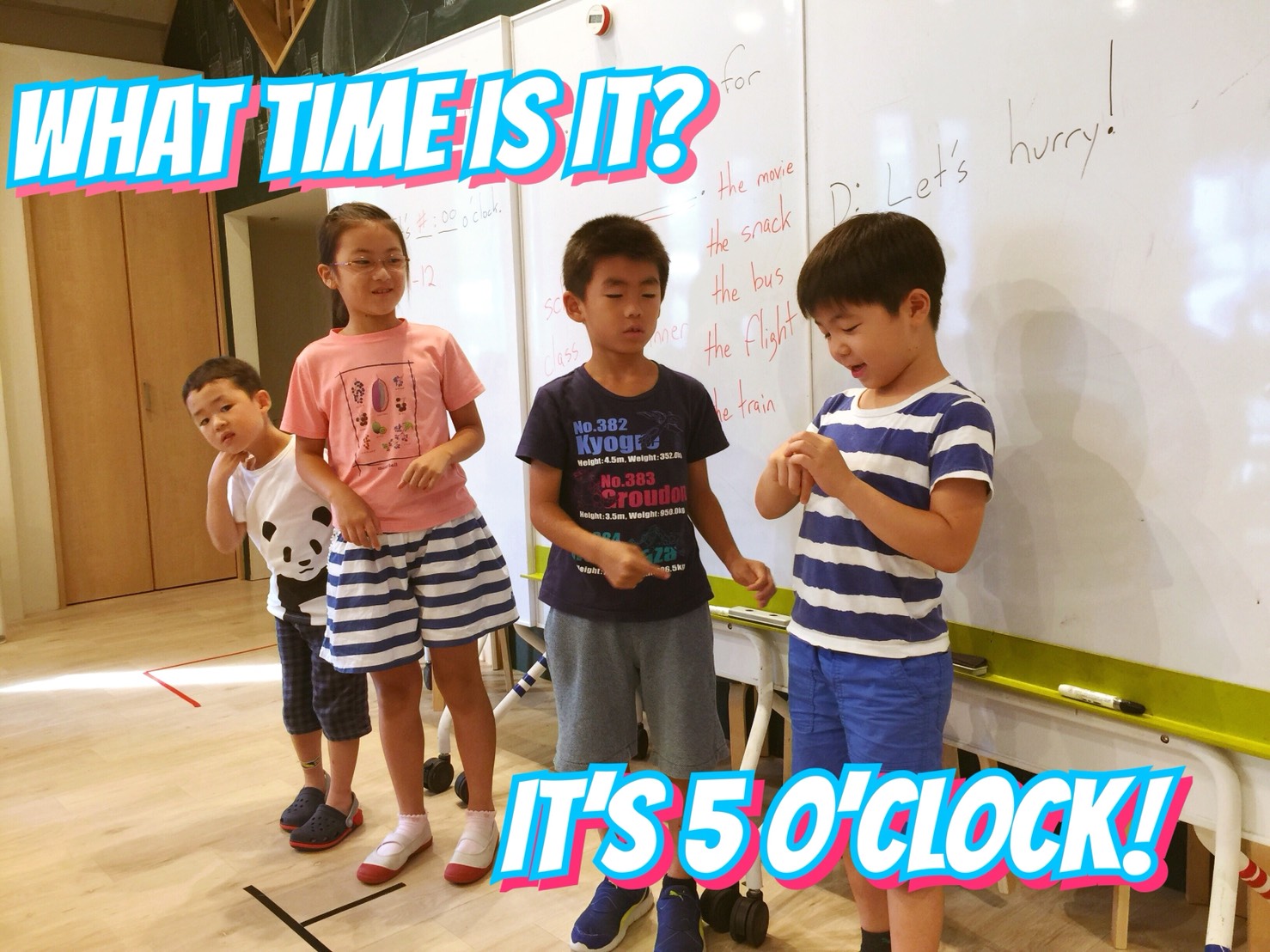 “Who has black shoes on?”(黒い靴を履いてる人)