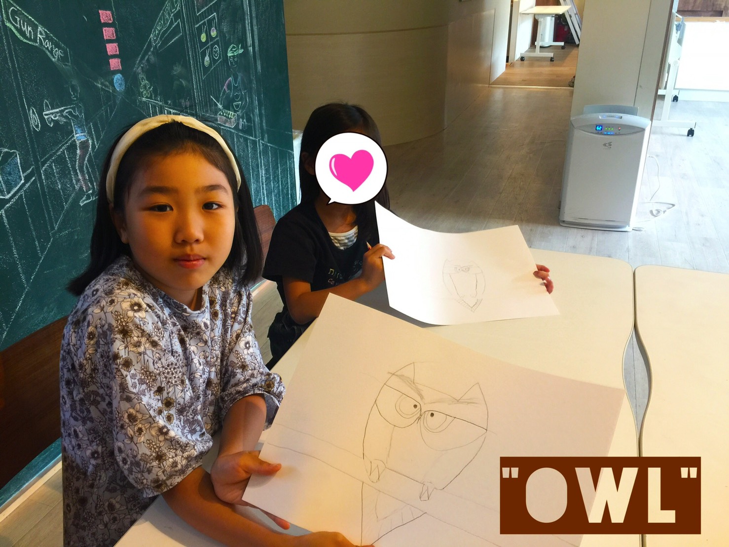 お題の”Owl”(フクロウ)を描き終えたら、空いているスペースに自分たちの好きな物を描いてたり、色を塗りました。