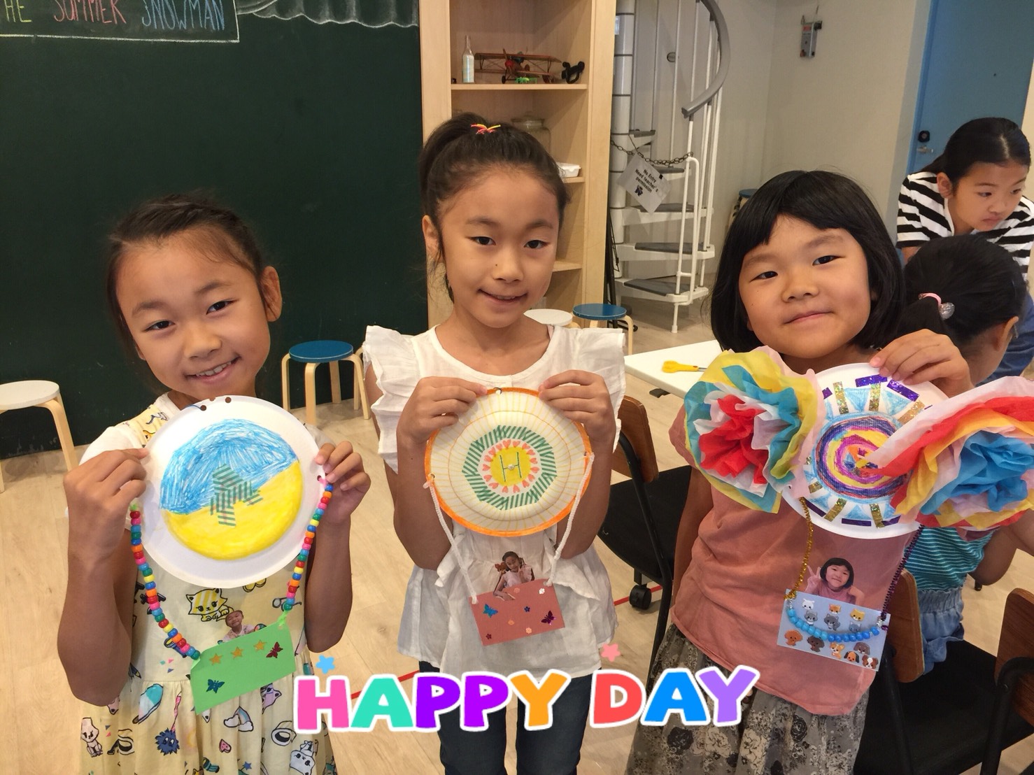 紙皿に好きなようにデコレーションをして、モールなどでつないだ紙に先生達が印刷をしてくれた自分たちの写真を張り付けました。