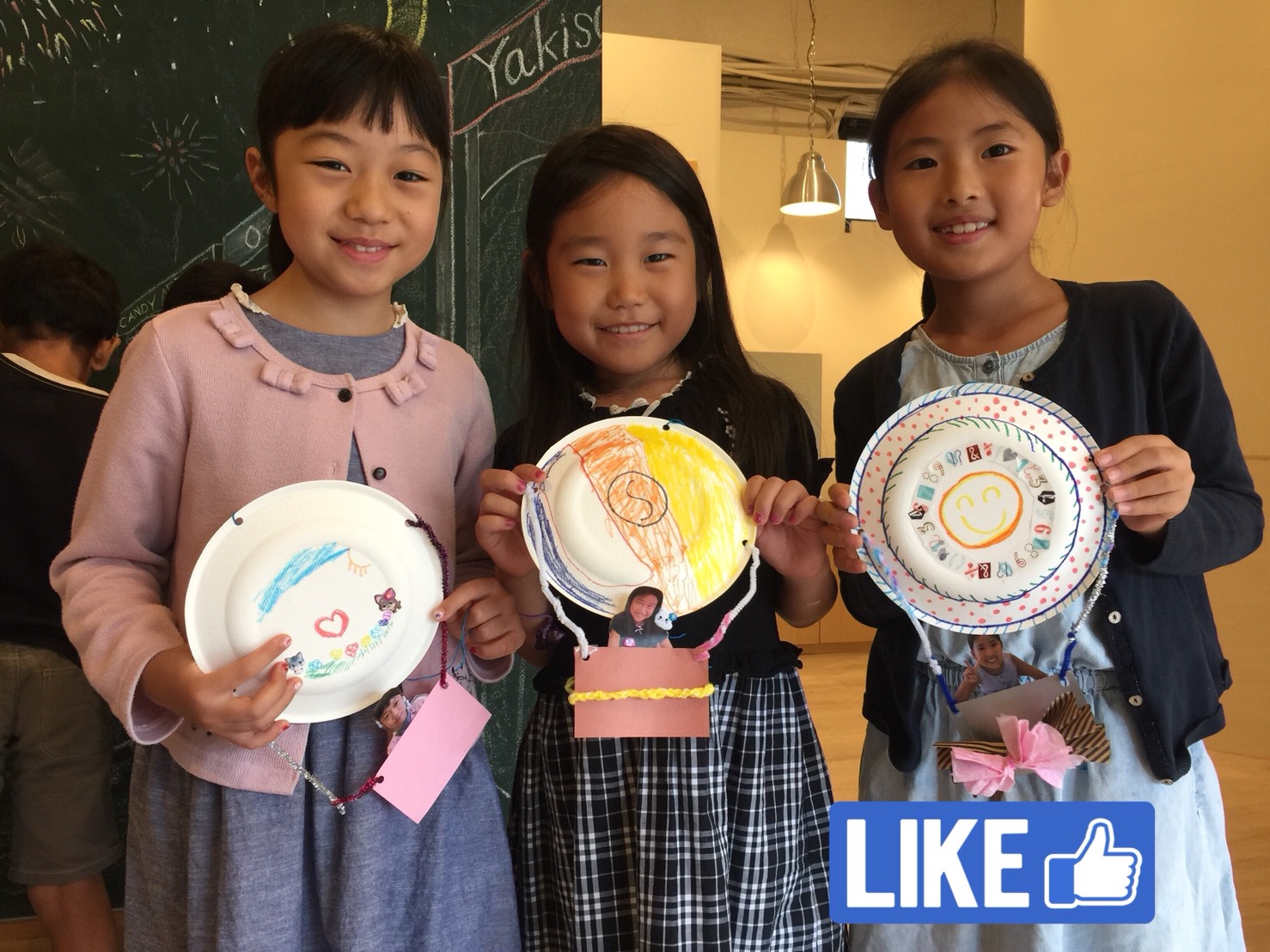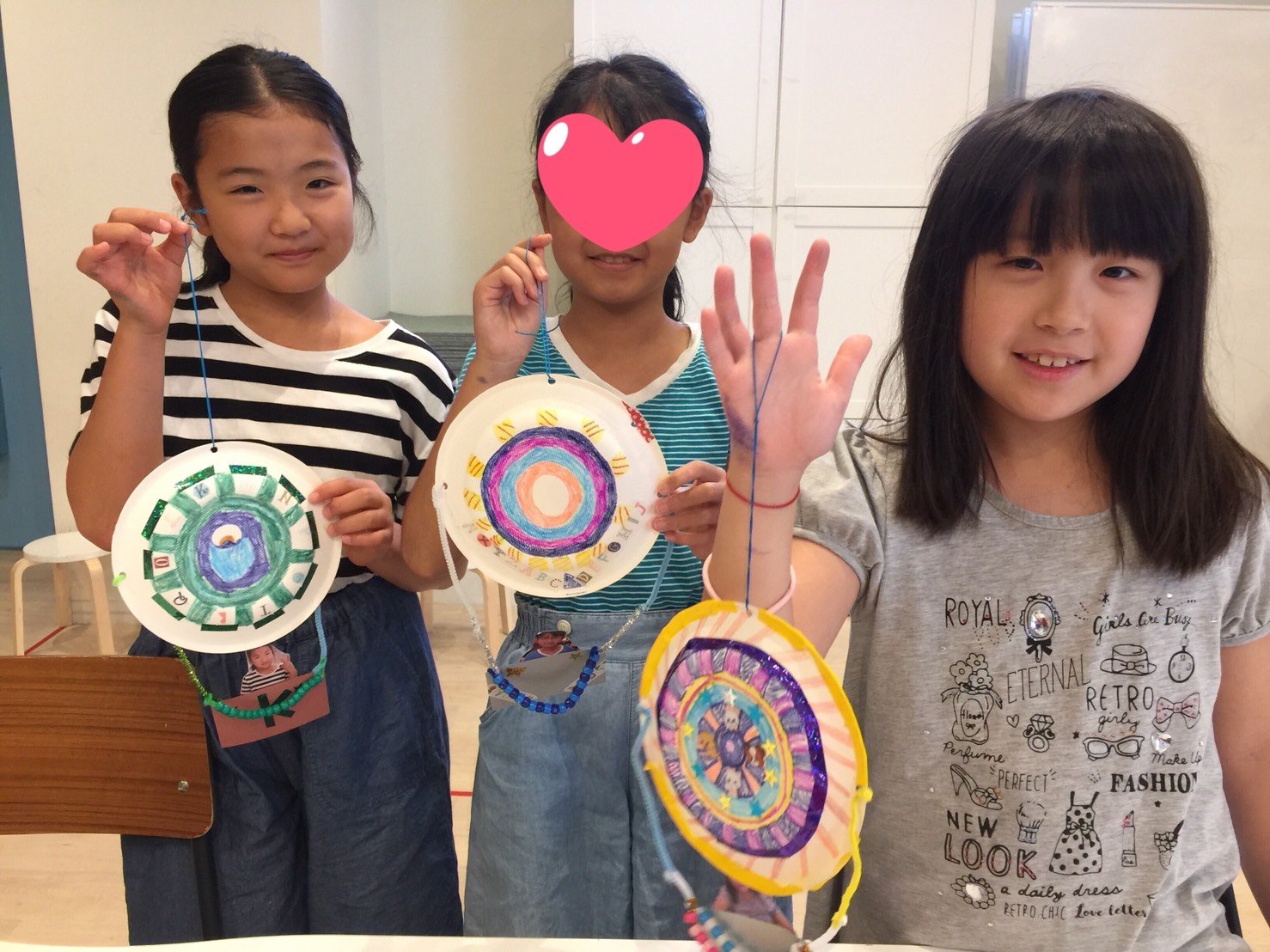 紙皿に好きなようにデコレーションをして、モールなどでつないだ紙に先生達が印刷をしてくれた自分たちの写真を張り付けました。