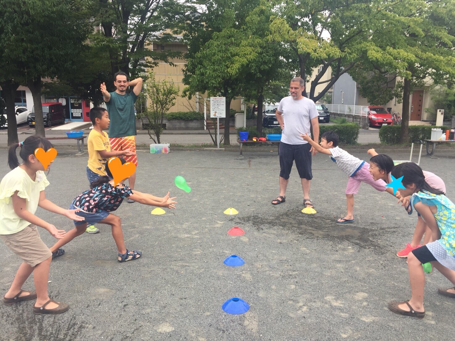 公園に移動して軽く準備運動をした後は、まずは“Water Balloon Toss”から始まりました。