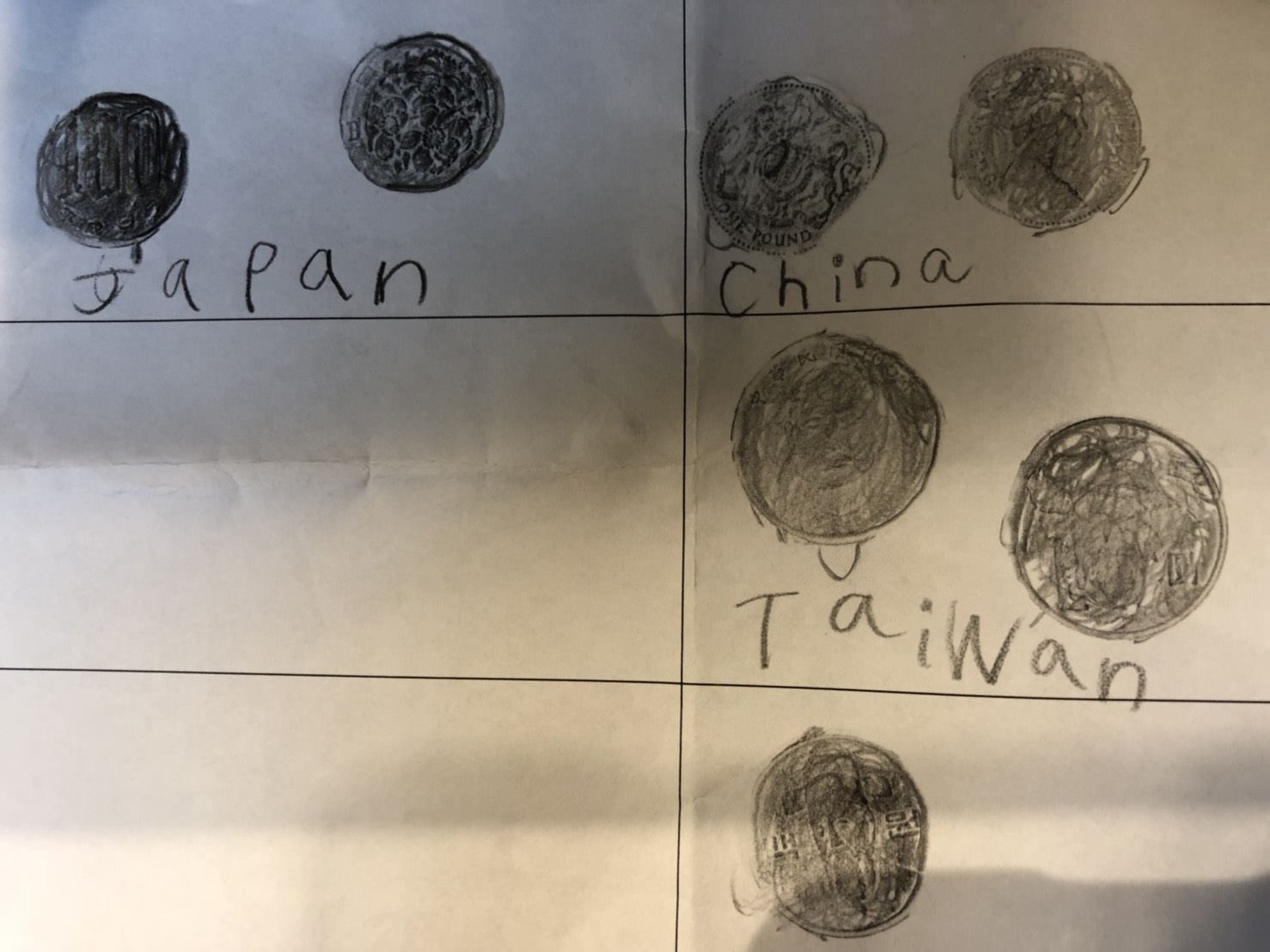 日本、中国、台湾、韓国、それぞれのコインの写し絵ができました!区によってお金のデザインも柄も違うね!