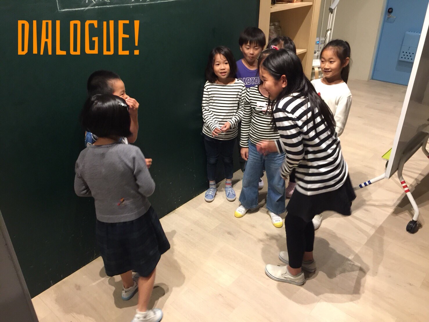 今日から新しくなった“Dialogue”。以前は決められたセンテンスがありましたが、今日からはテーマが決まっており、そのテーマをもとに、先生と一緒に会話をつくって発表します。