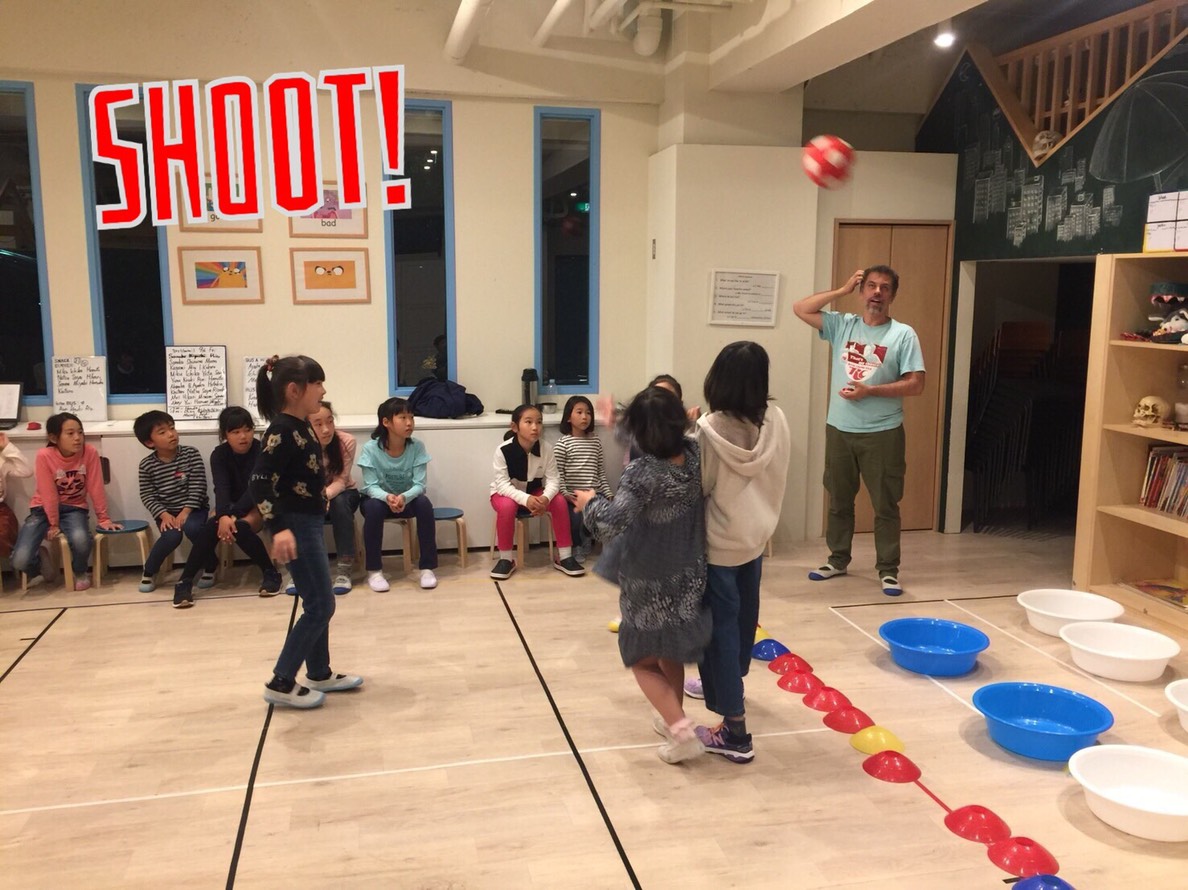 大きな声で正しく単語が言えると、先生がボールを投げてくれるので、キャッチをして床に並べてあるバケツに”Shoot!”(シュート!)