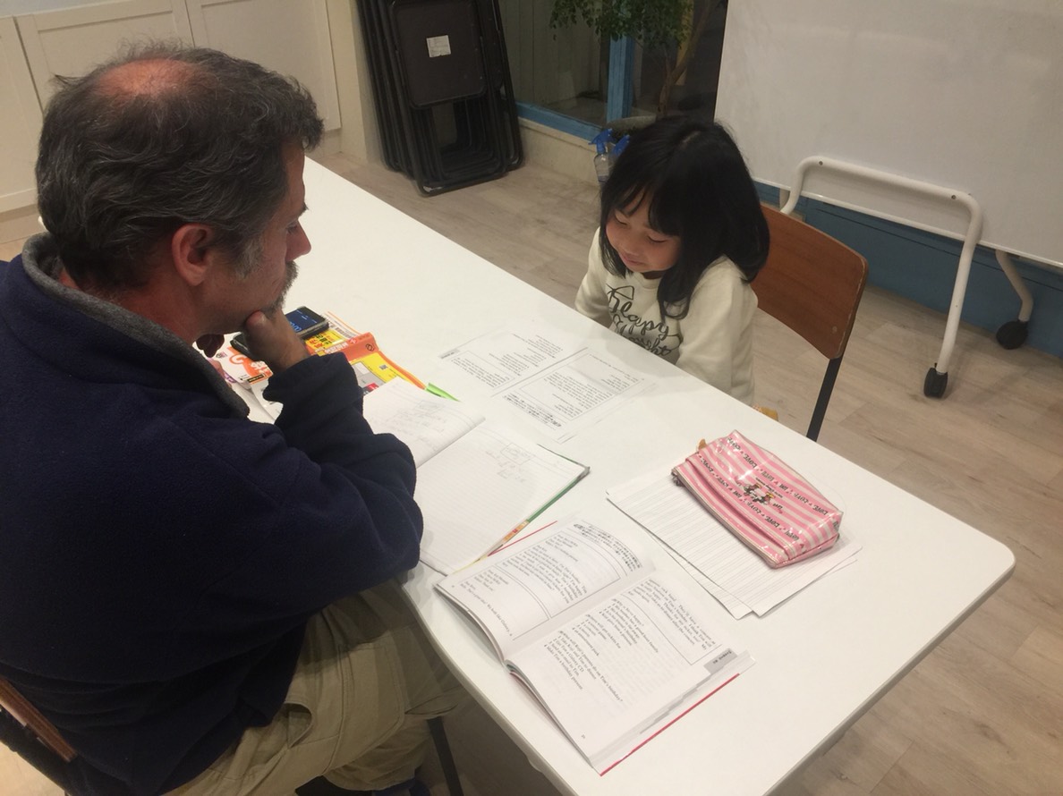 ストーリータイムの”Practice time”(練習の時間)には、みんなとっても真剣に練習をしている姿が見られます。 読み方や発音が分からない部分があったり、まだ文章を読めない生徒さん達は積極的に周りのお友達や先生達に”Help me”(手伝って)と声を掛けています。