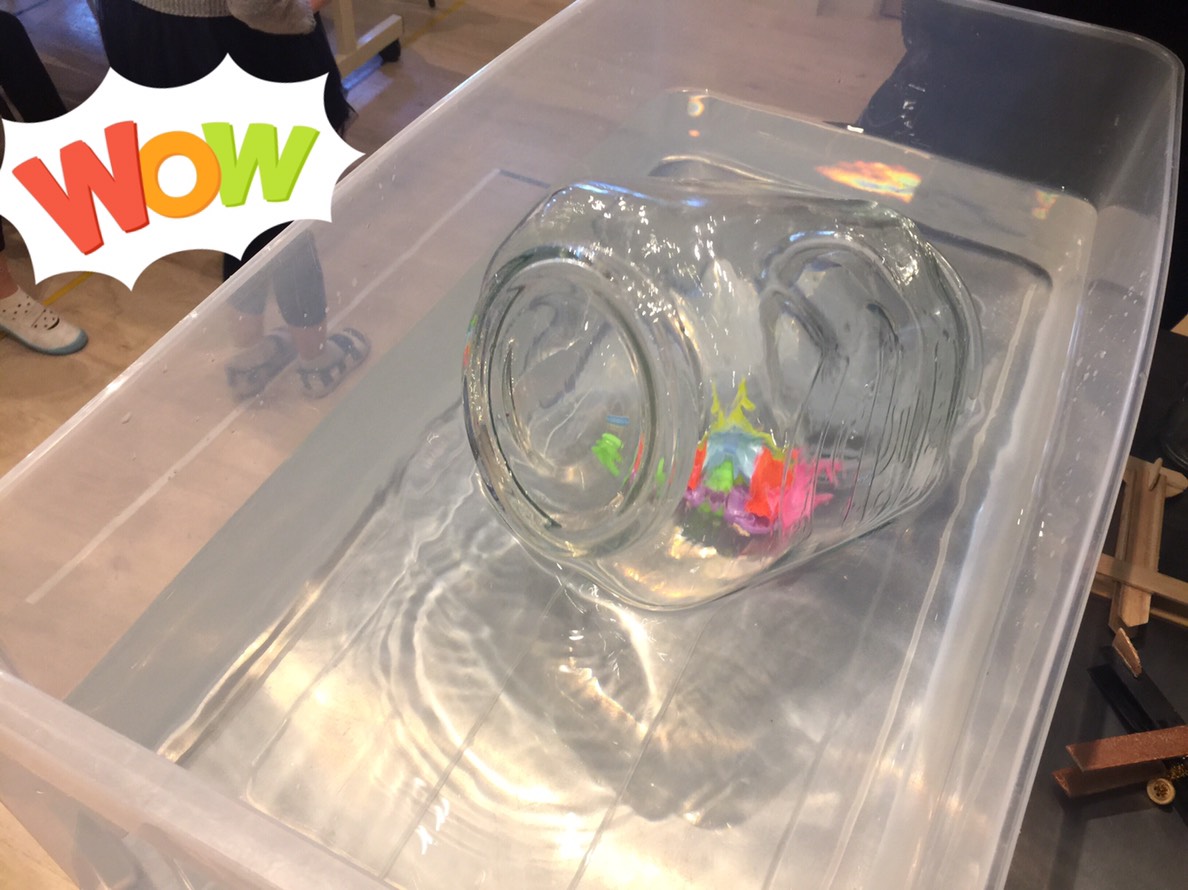 水の入った容器にいろいろな物を入れて、浮くかな?沈むかな?を予想して実験!