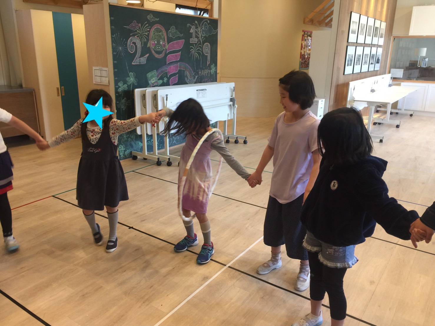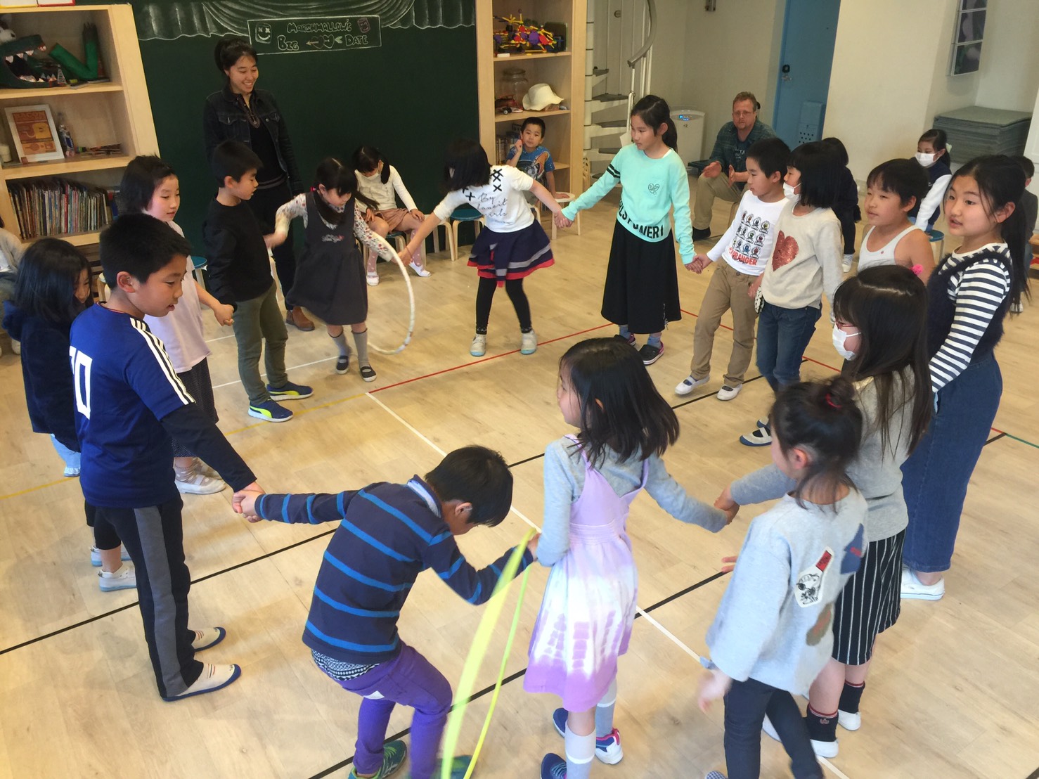 今日は”Hula Hoop Relay”(フラフープリレー)をやりました