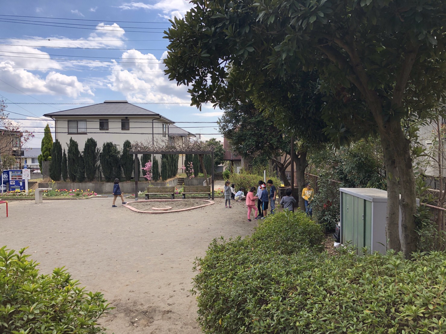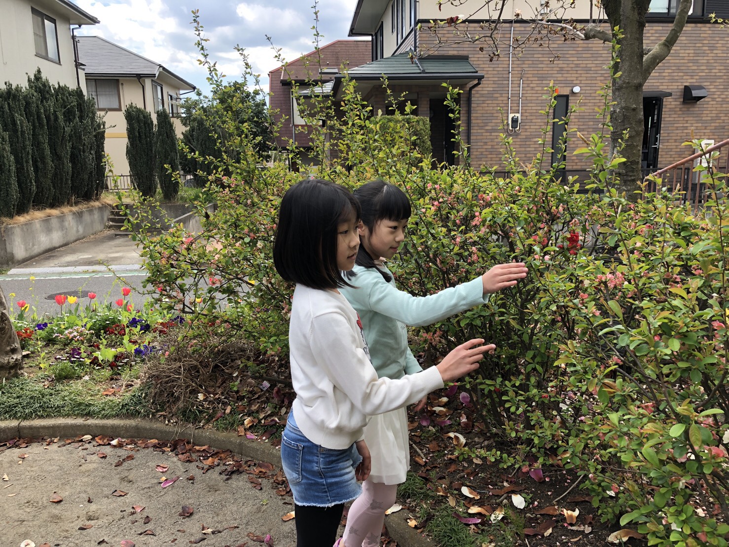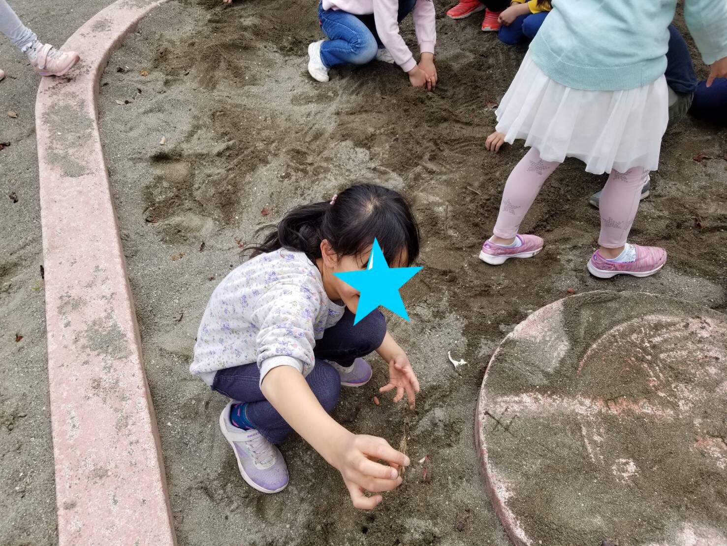 近所の公園にあらかじめ先生が隠してくれた”Treasure”(宝物)を探しに出かけました。