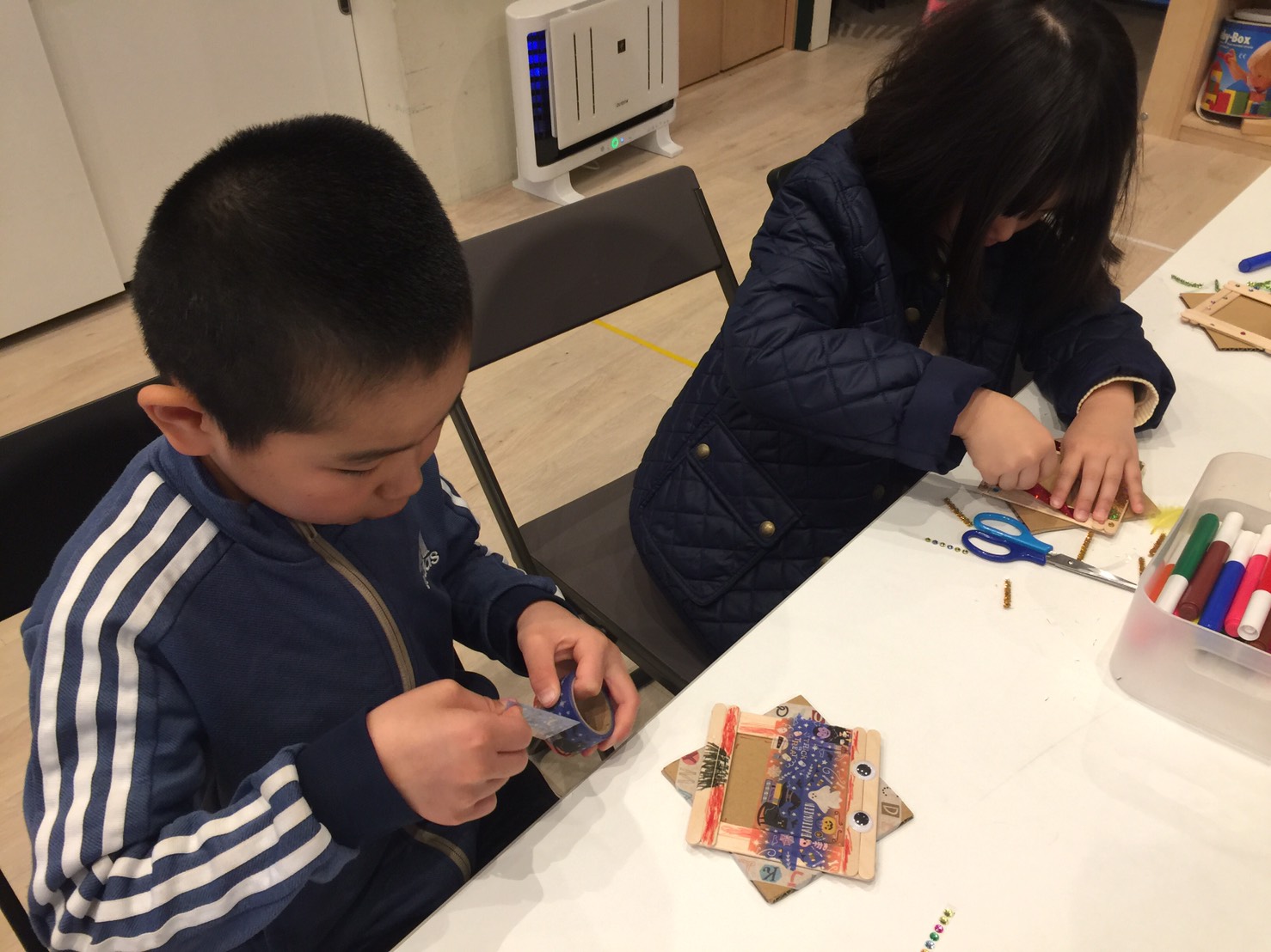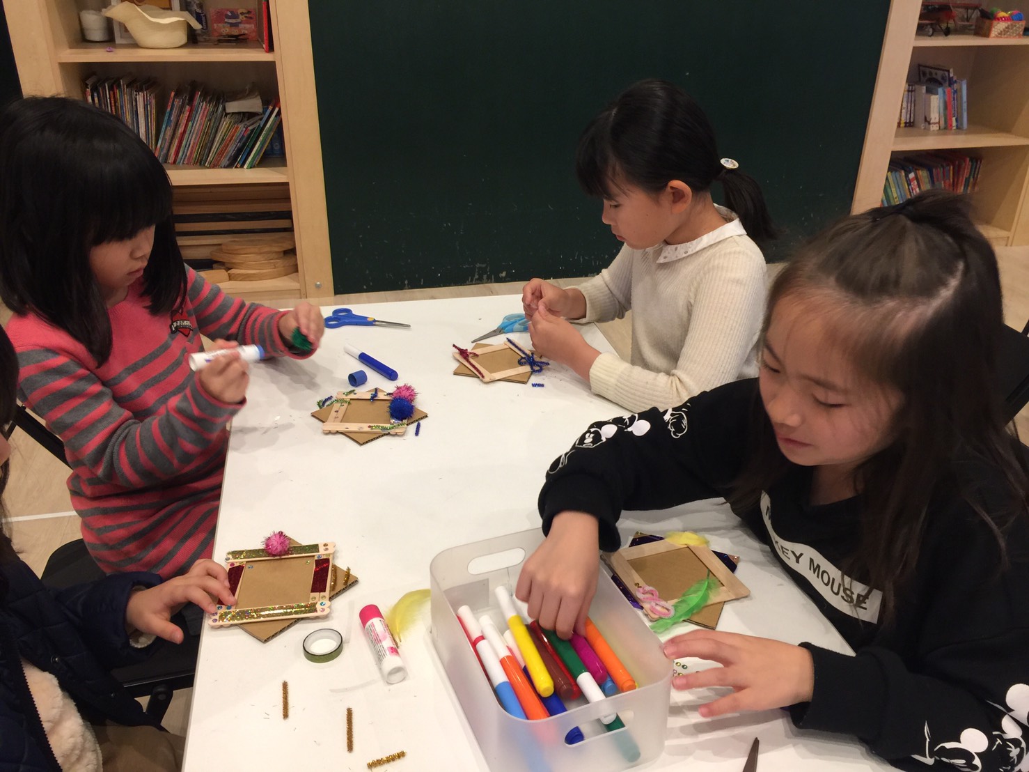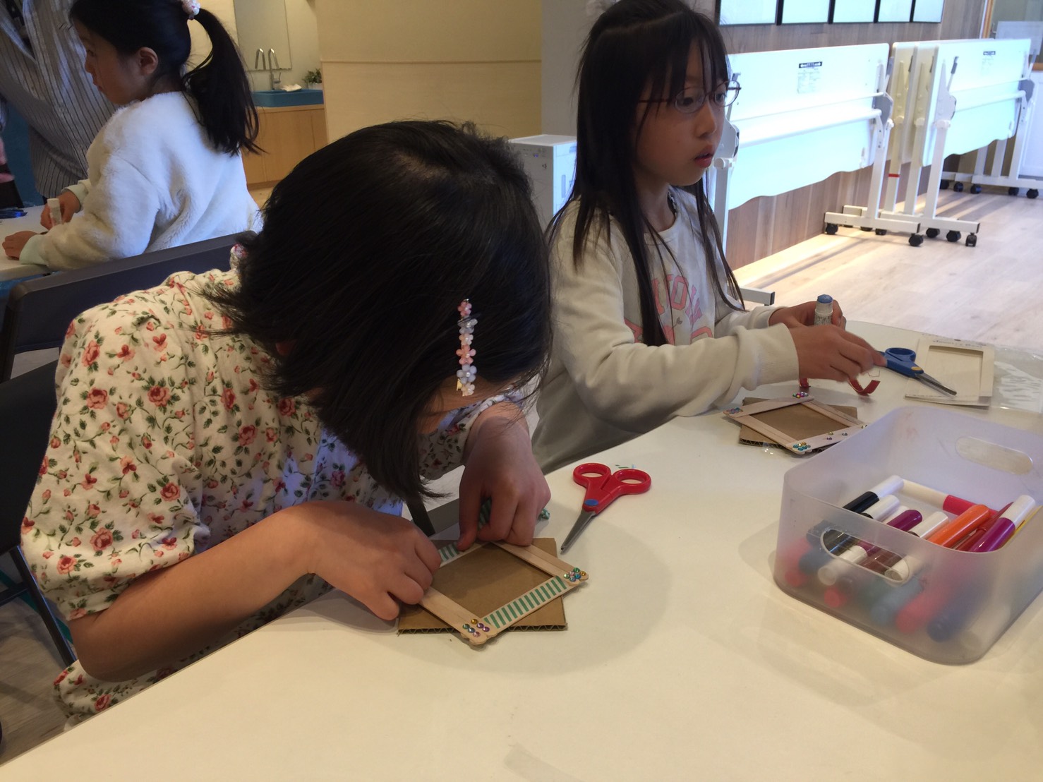 先生が用意してくれたアイスの棒で枠を作り、自由にいろいろな飾り付けを行いました。