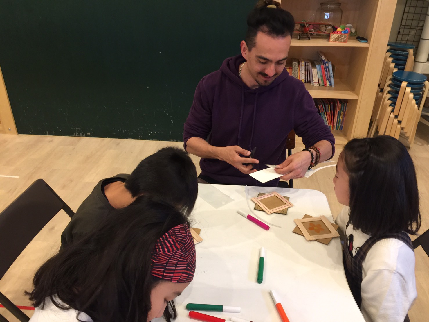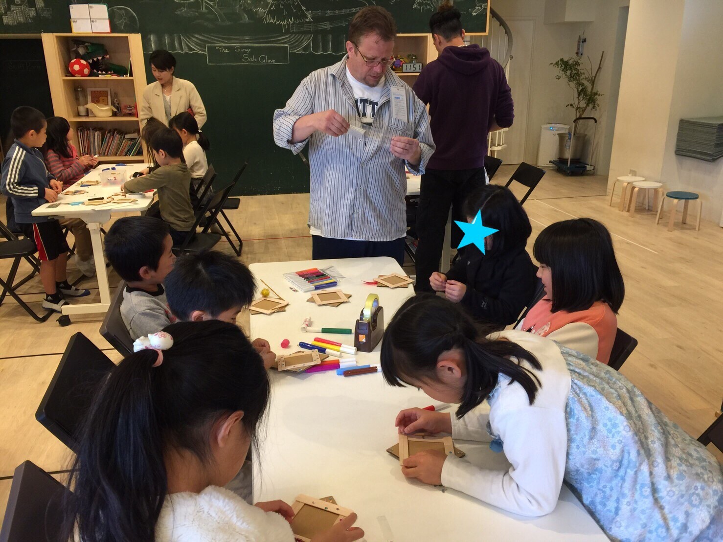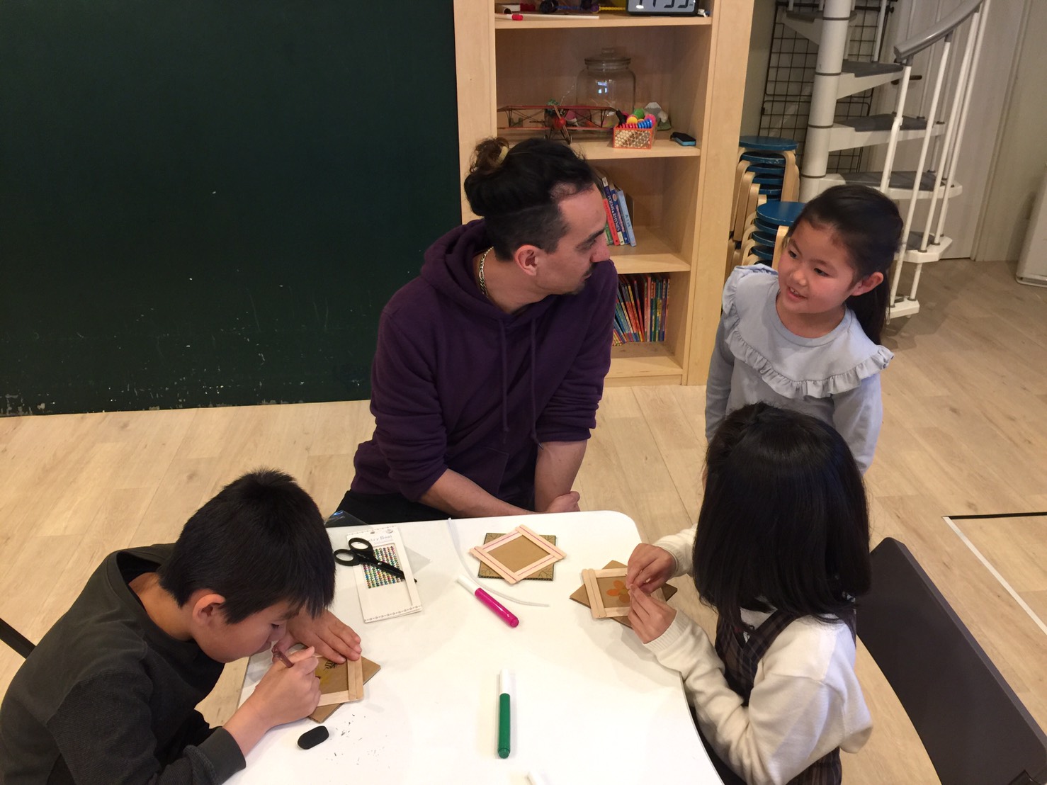 先生が用意してくれたアイスの棒で枠を作り、自由にいろいろな飾り付けを行いました。