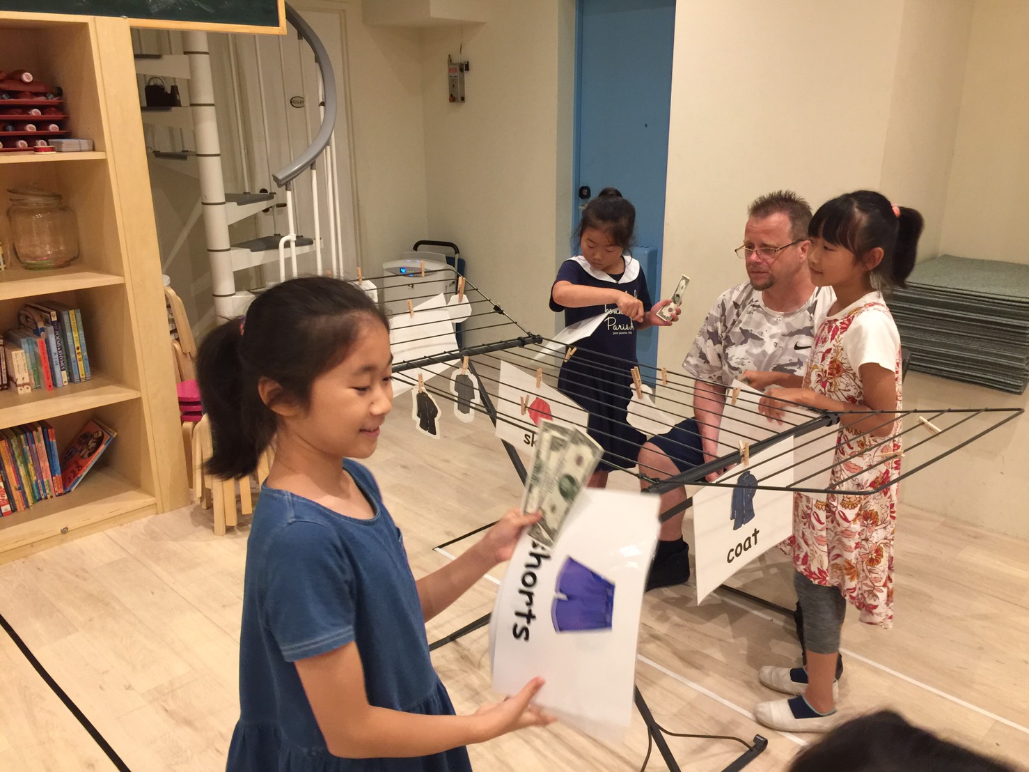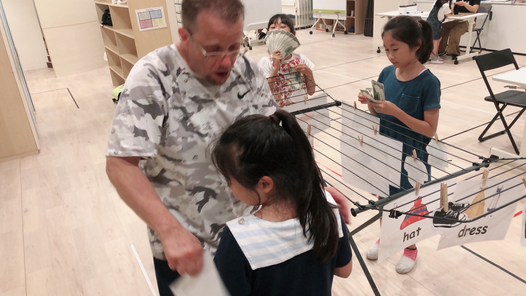 先生:”Let me see. Those shoes are nine dollars. Would you like to buy those?”(そうですね、そちらの靴は9ドルです。お買い上げになりますか?)