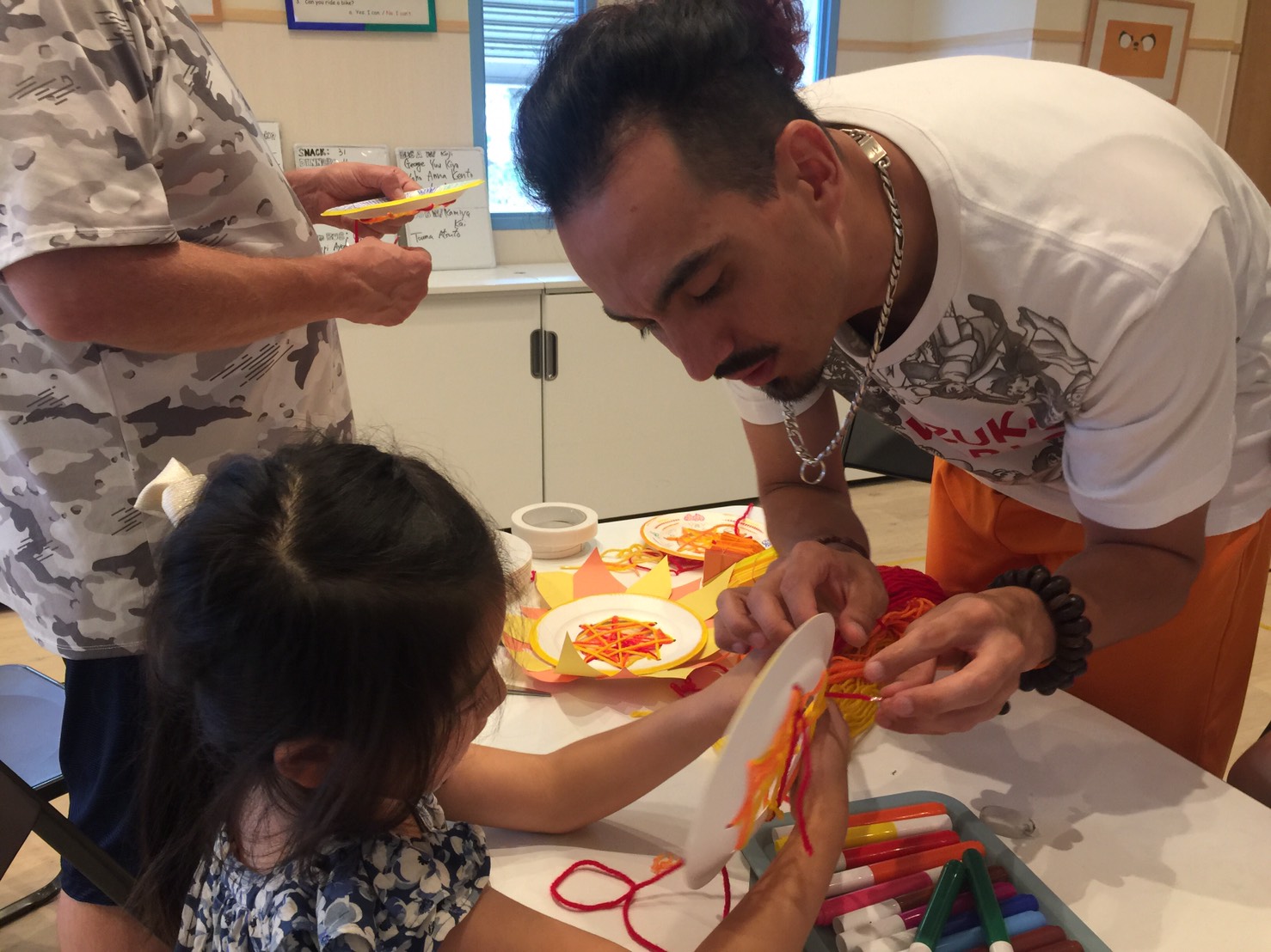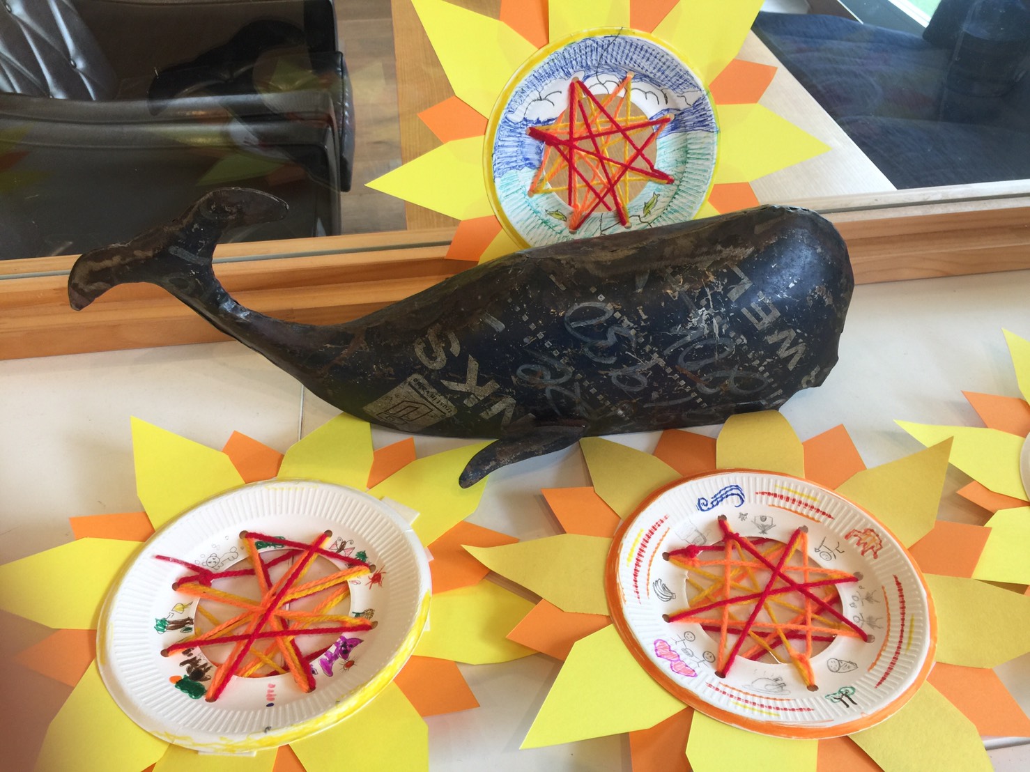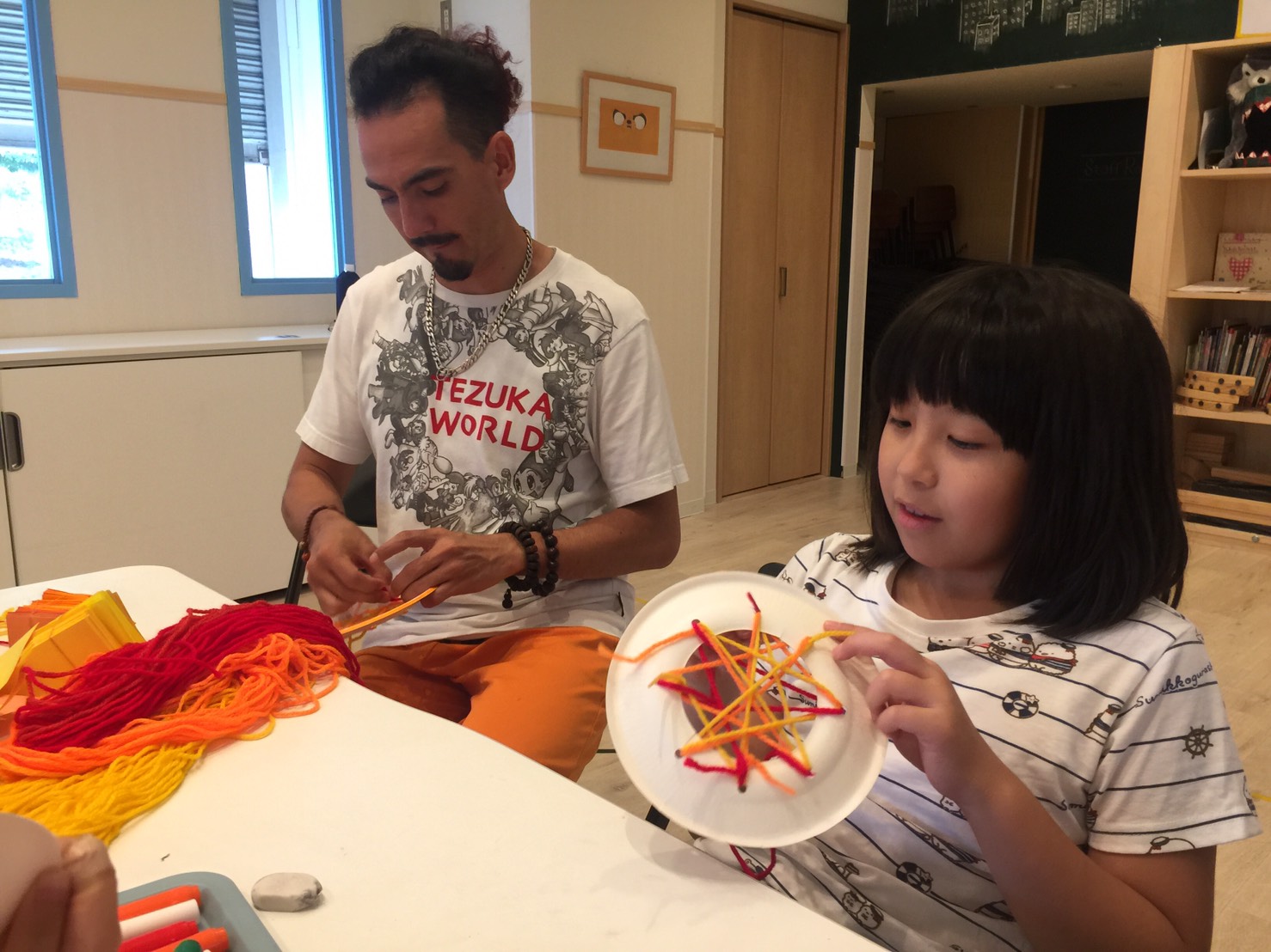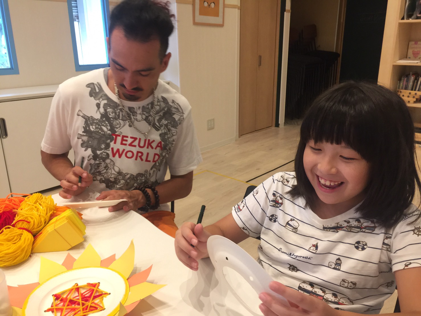 聞きたいことや伝えたいことを言える練習をしながら、手順通りに紙を貼ったり毛糸を編んで”Summer Sun”(夏の太陽)を作りました。