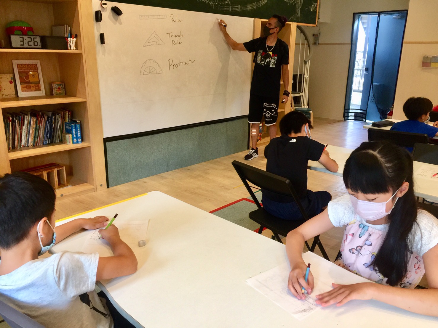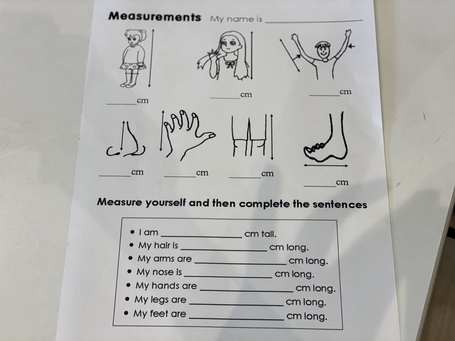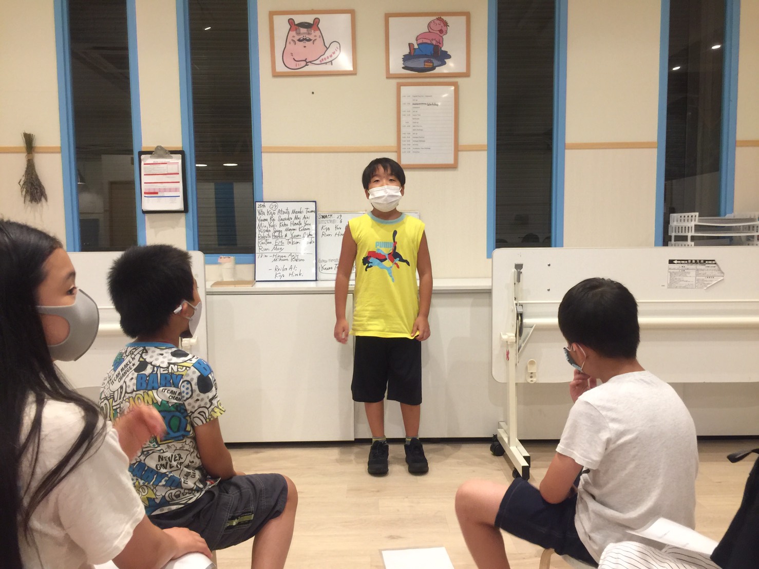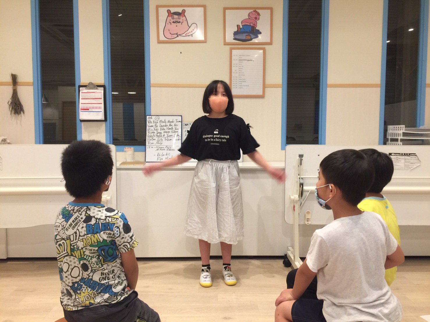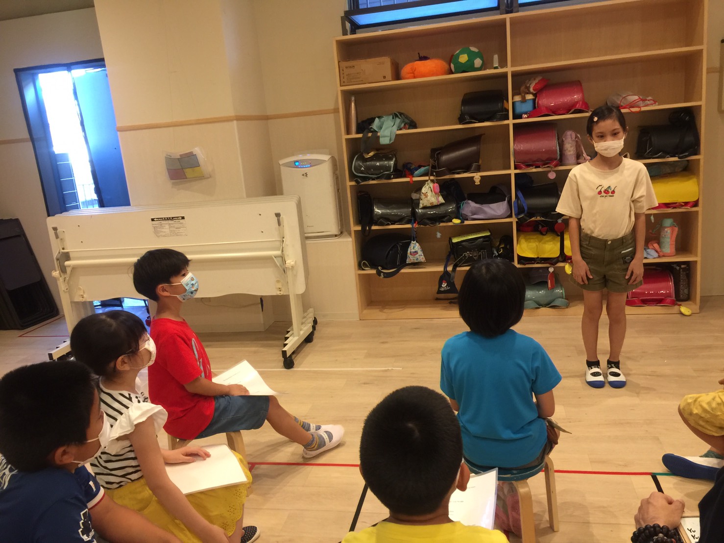 フラッシュカードやワークシート、部屋の中の物などを使って「形」や「色」の単語を練習しながらQ&Aをやっています。