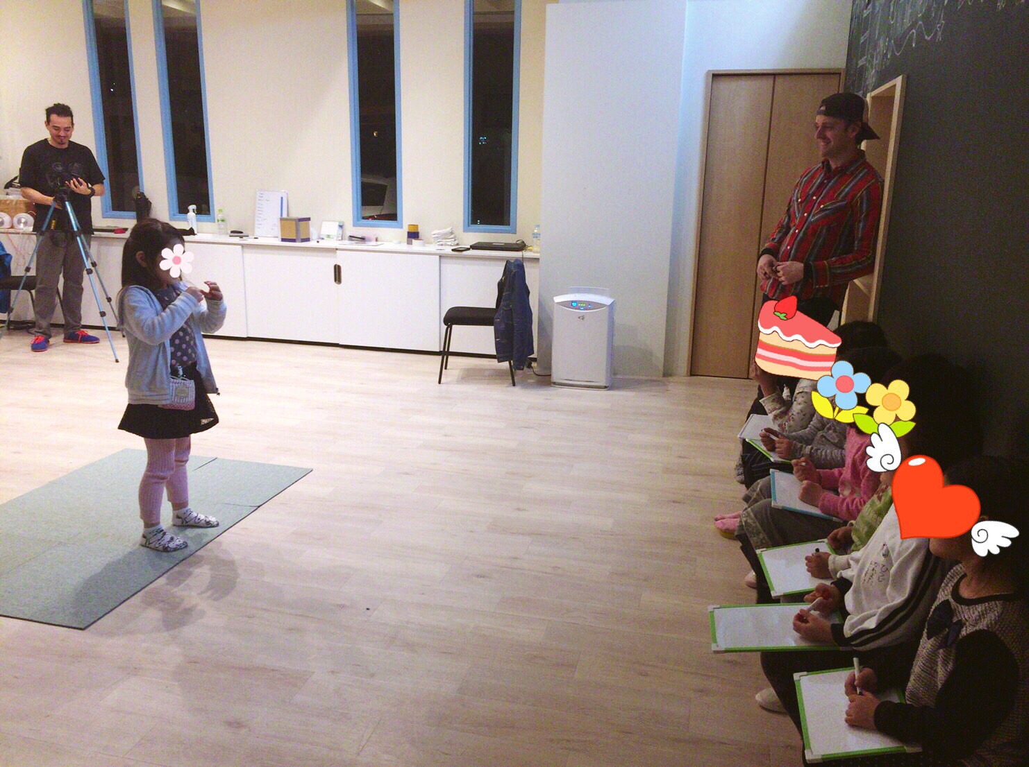 まずは、マイク先生がステージに立って短い演技をします。動作、セリフ、表情などをよく見てよく聞いて、1人ずつステージに立ってマイク先生を”mimic”(真似)しました。