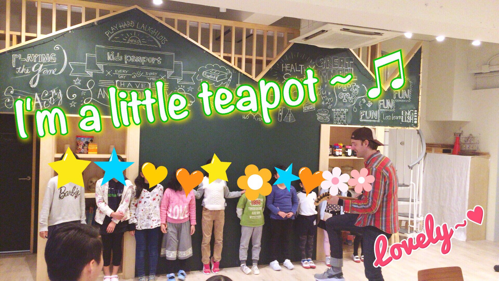 マイク先生のギターに合わせて英語の童謡を歌いました。♪I’m a little teapot, short and stout.♪(僕は小さなティーポット)