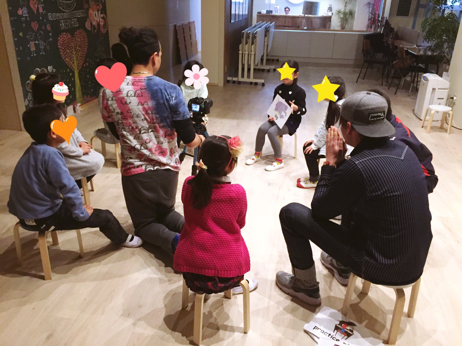 センテンスゲームなどのアクティビティが終わった後は、みんなで輪になってお話しをします。 今日のお題は”School”(学校)