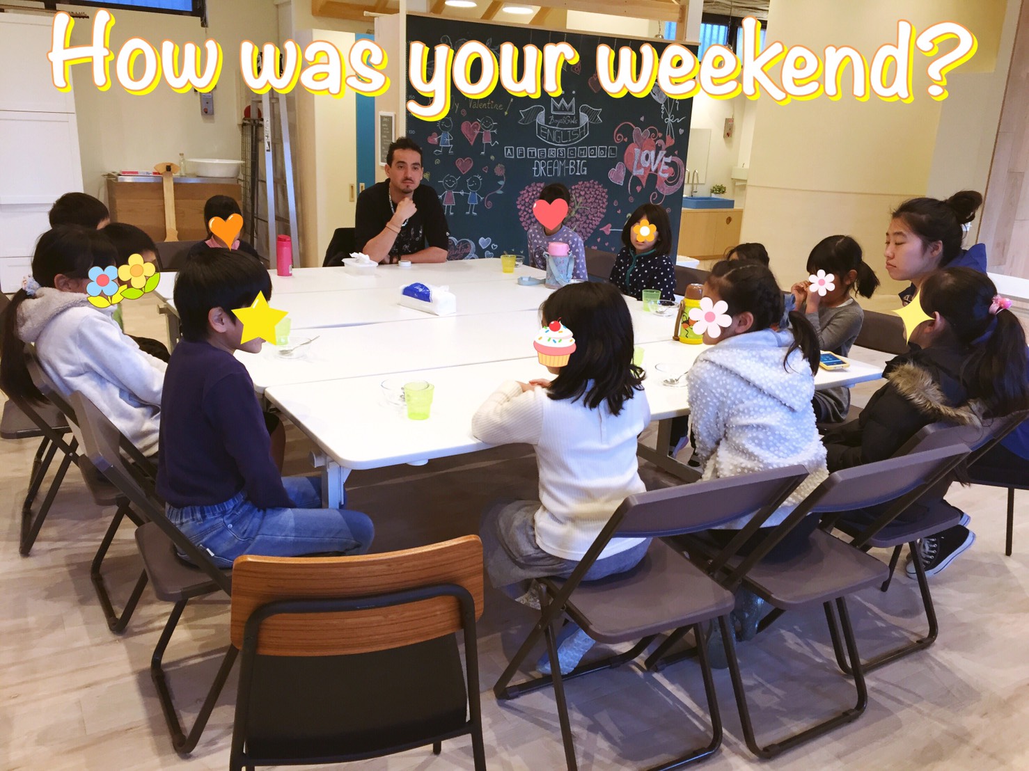 今日のオヤツの後のサークルタイムは「週末がどうだったか?」を聞く練習をしました。
