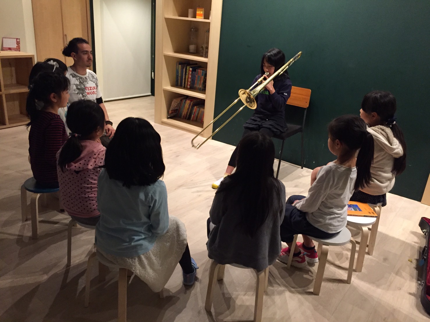 自分の好きな本、クラブで練習をしている楽器や入学式の写真などを持って来て発表してくれました。“This is my book.”(これは私の本です)
