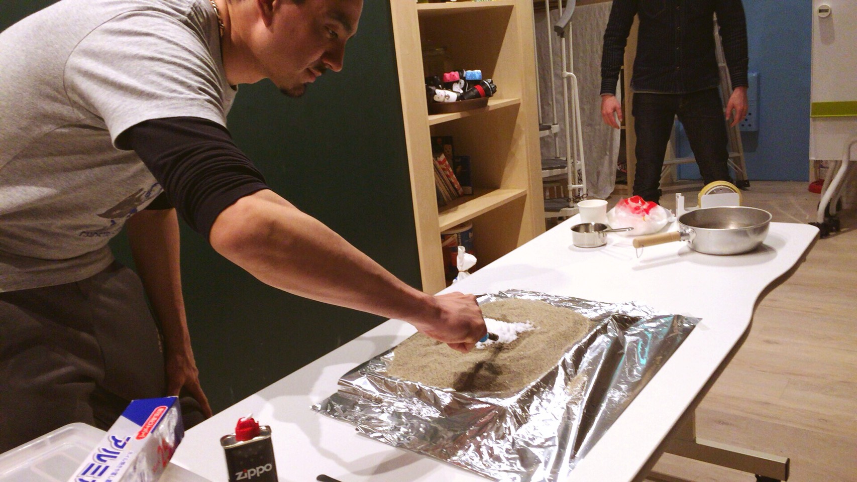 砂を鉄板の上に敷き詰め、十分なライター液を振りかけます。