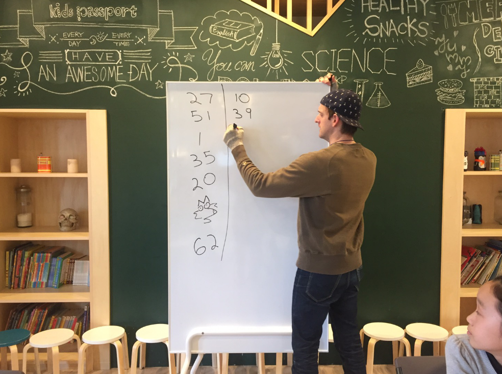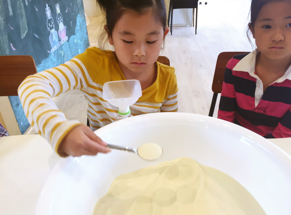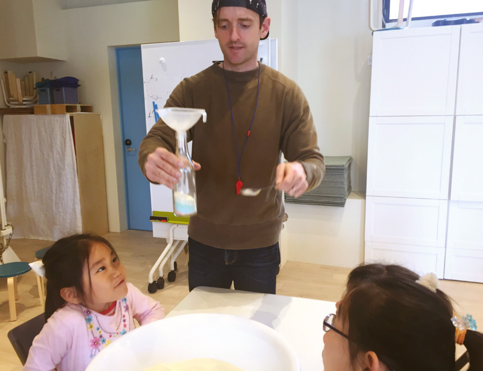 白い砂に赤、黄、青、緑の色を付けてボトルに色の層を作るアートです。マイク先生:“There are four tables, and I am going to tell each one of you which table you are sitting at.”