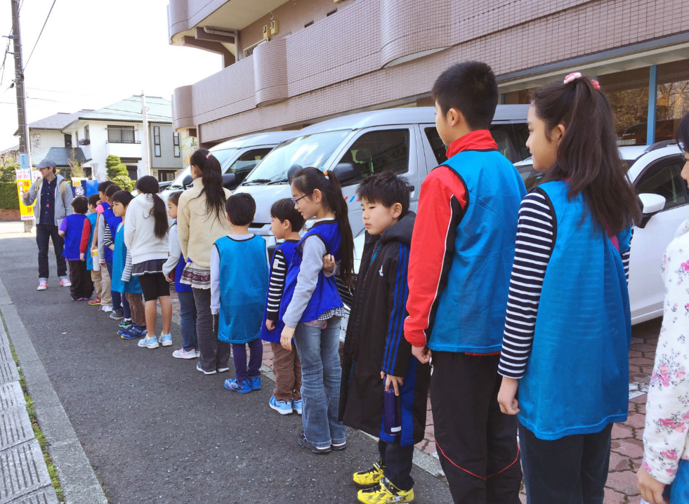(水筒を持って、青いシャツを着て、靴を履き替えたら列に並んで)