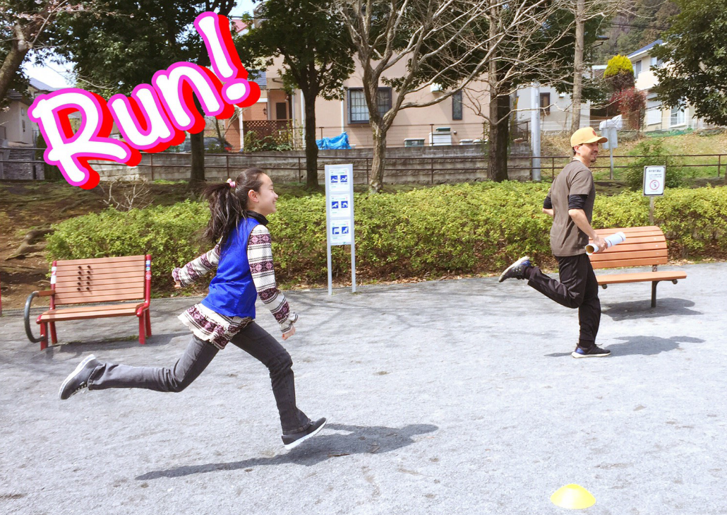 “I will throw the balls so you have to catch it and run.”(先生がボールを投げるから、キャッチして走ってね)