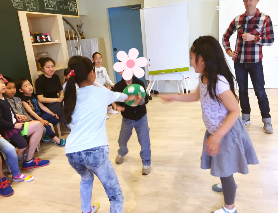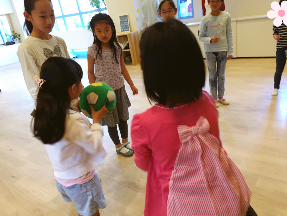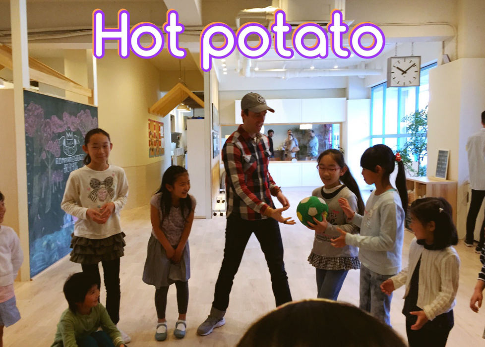 まずは、”Hot potato”で肩慣らし。体験生と一緒になって緊張をほぐします。
