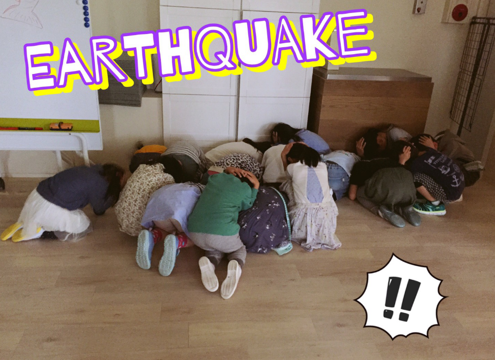 スツールに座って、歌ったり楽器を演奏したりしながら”Music time”(音楽の時間)を楽しんでいると突然・・・緊急地震速報が鳴りました。一瞬、顔を見合わせましたが、みんな走って”Safety zone“(安全な場所)に移動をしてしゃがみ、頭を抱えて先生達からの指示を待ちます。