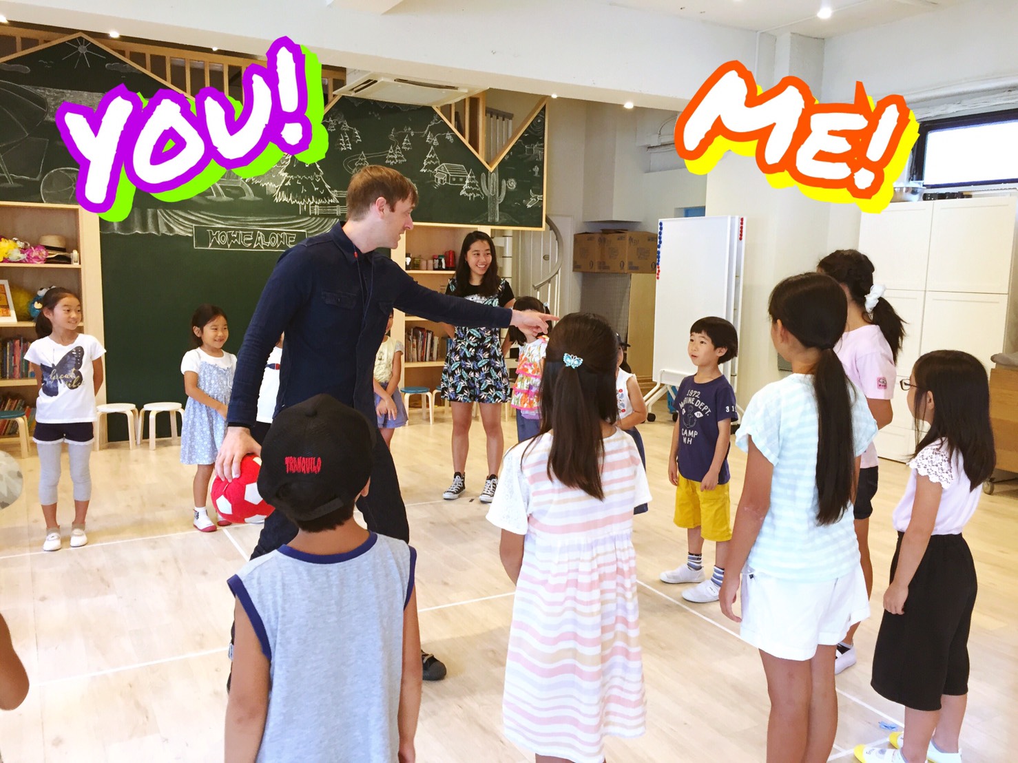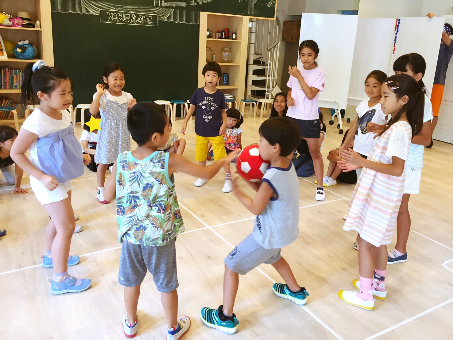 まずは、ボールを使ったゲームで簡単な英語の練習からです。