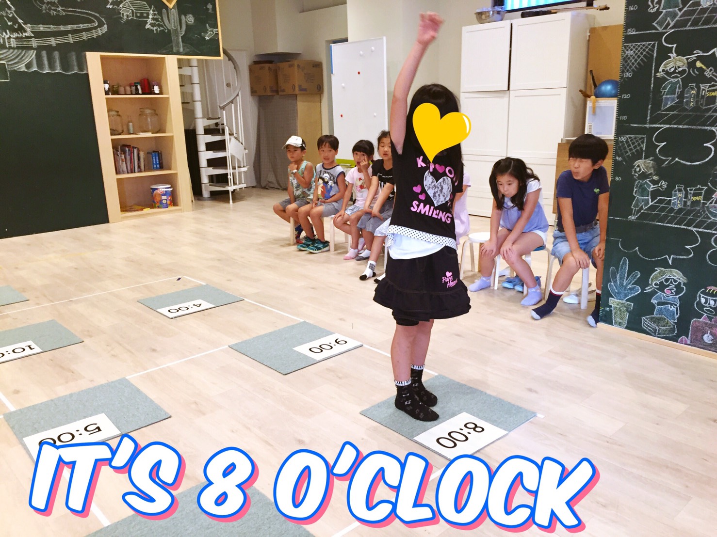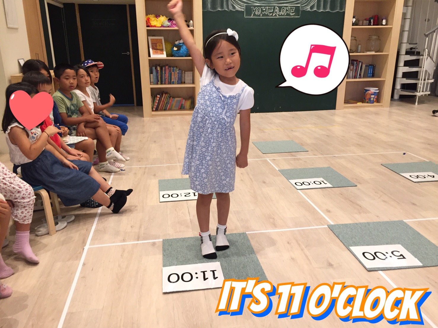 そのあとは、時間・数字を使ったセンテンスゲーム、マイク先生のジェスチャーと言葉を真似をするミミック・マイクをしました。