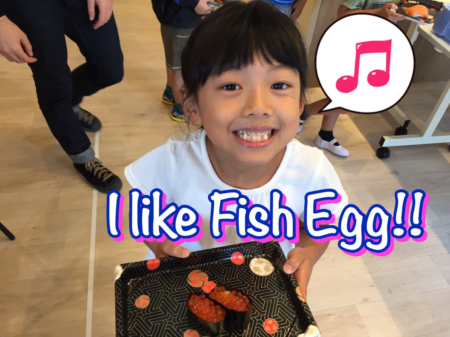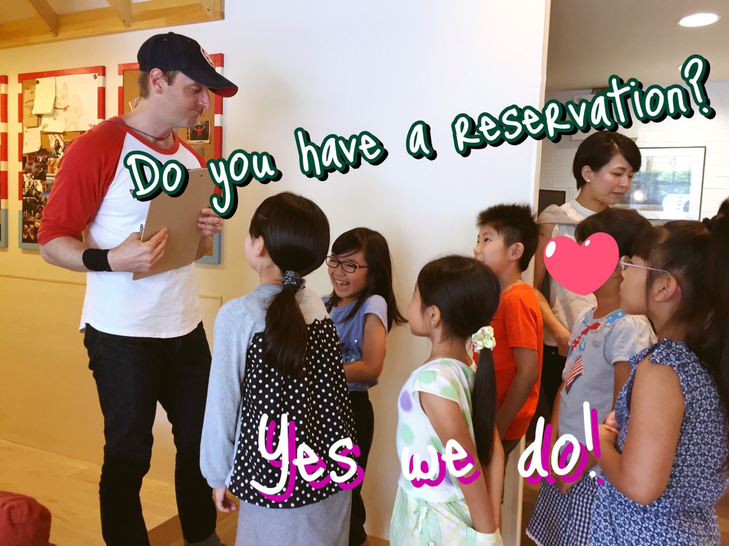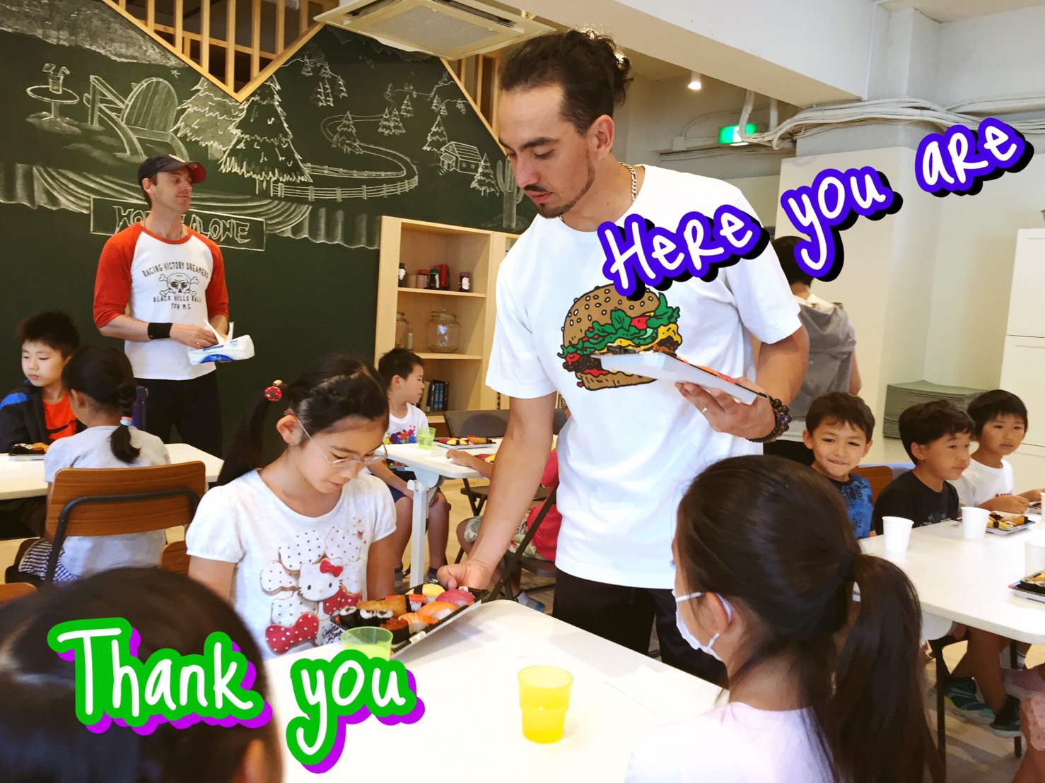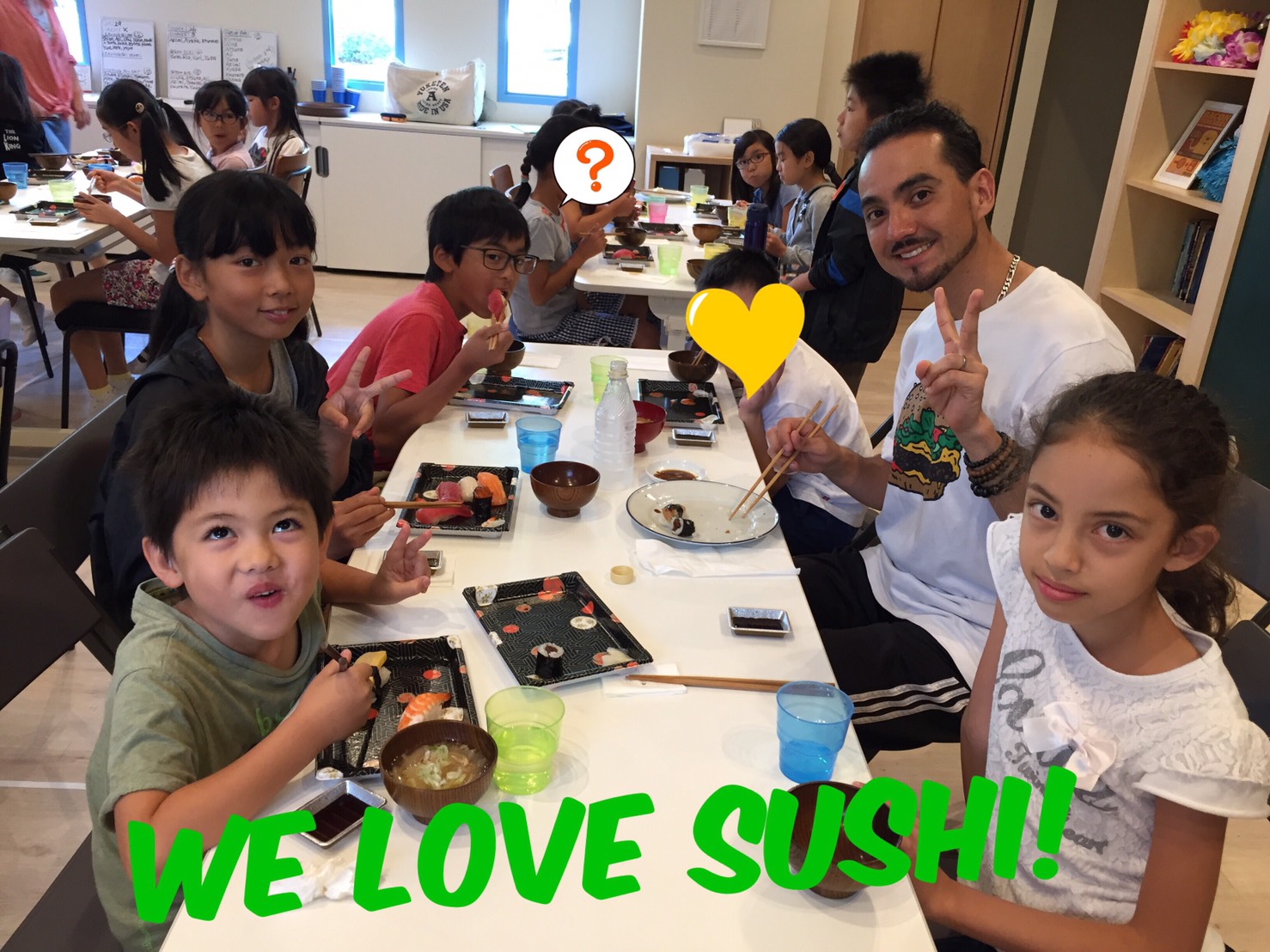 さぁ、いよいよお寿司の時間ですが、、、今日はレストランにいったときの想定をして入店〜のシミュレーションです。先生たちが店員さんとなって迎えます。先生:”Welcome to Smokey’s Sushi.”(スモーキー寿司店へようこそ)