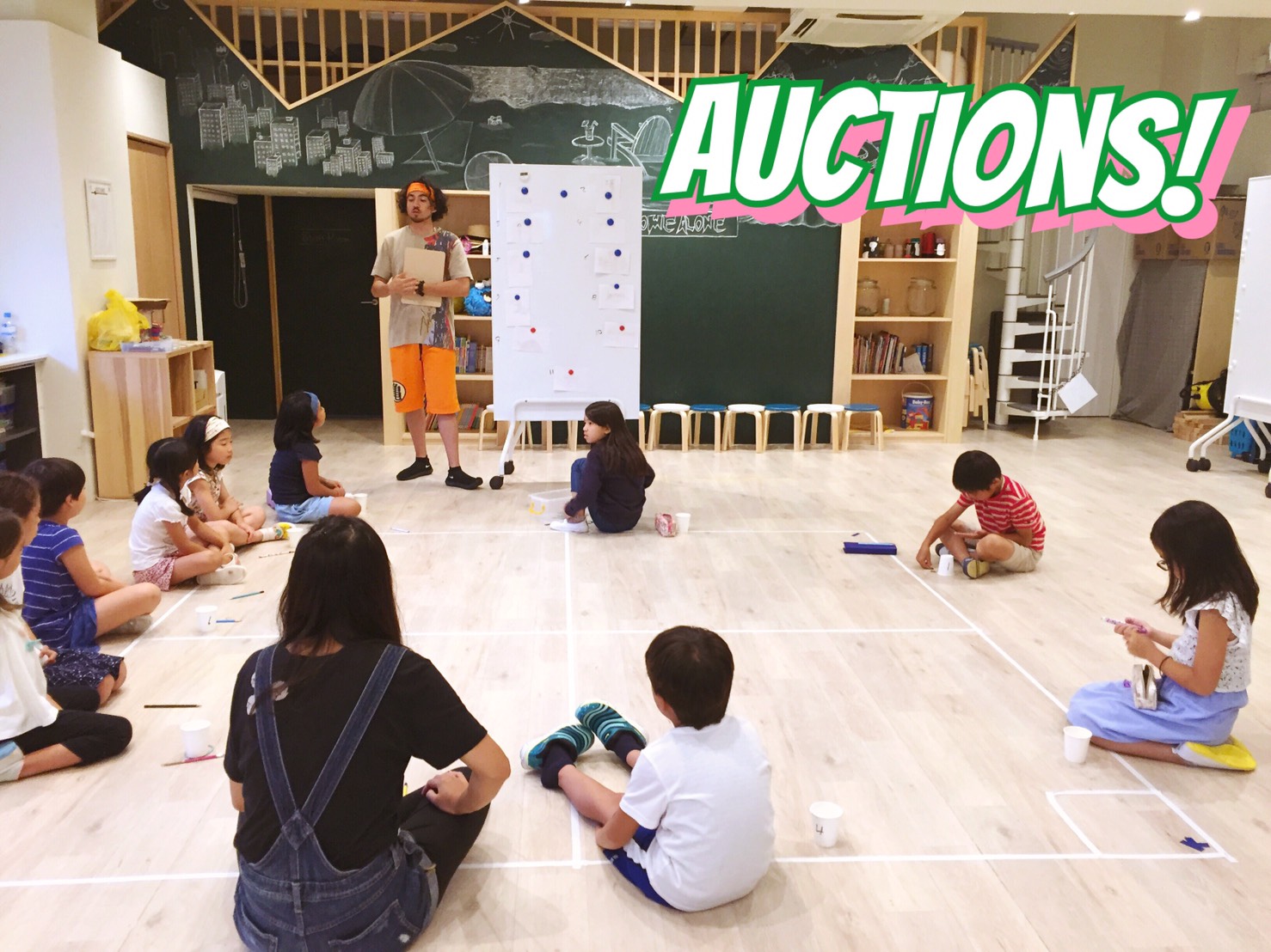 午後はヨガからはじまり、ミミック・マイクではいろいろな表現を「マネ」しました。そして今日も自分で書いた絵をオークションに出して、入札したり、落札した絵からドルを稼いだりと、大盛り上がりでした。
