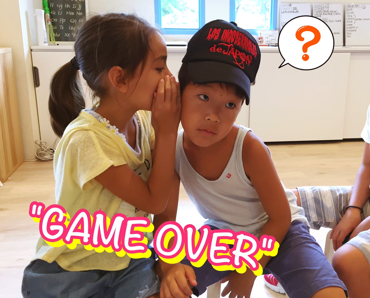 続いては、伝言ゲーム。先生が言った言葉を聞き取って、次の人にちゃんと伝えられるかな?