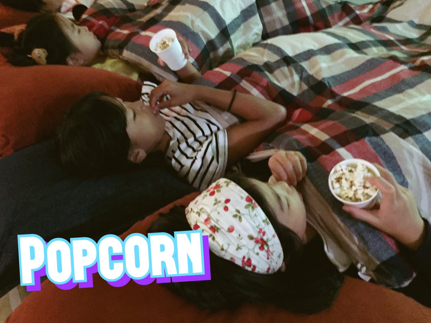 今日の映画は、南の島の少女の物語。マットを敷いて、クッションとブランケットを用意して、ポップコーンをもらったら”Let’s watch a movie together.”(一緒に映画を観よう)