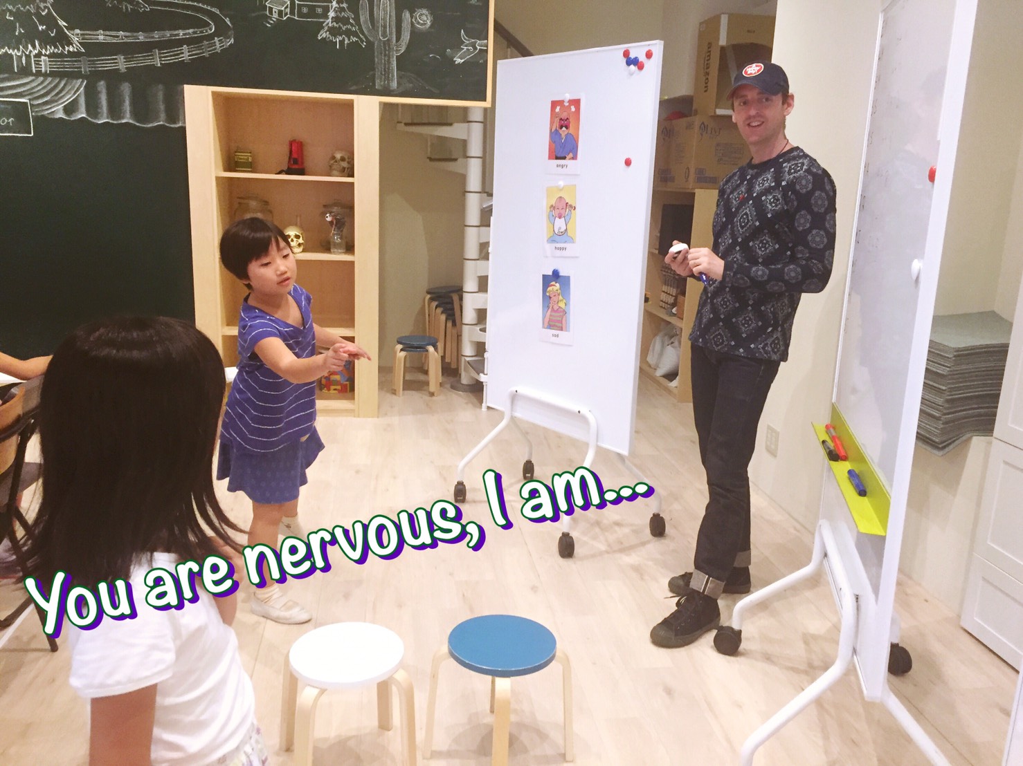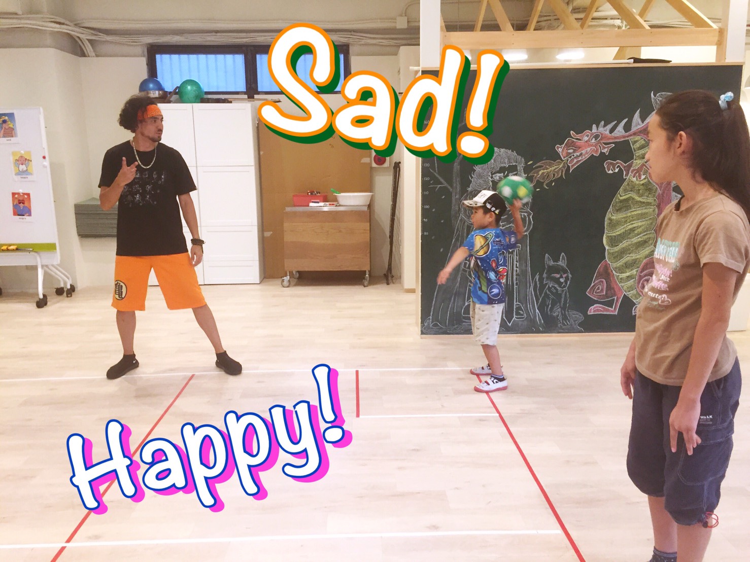 早く言う競争をしたり、ボールを投げながら単語を言ったり、センテンスを作る練習をしたり、歌ってみたり・・・