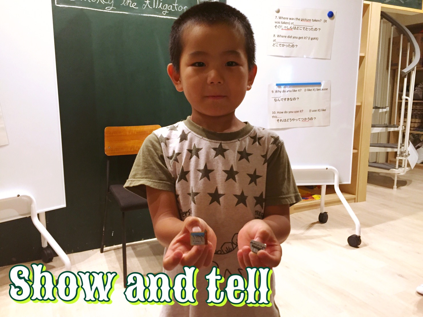 その後は“Show and tell”スクールにあるもの何でもいいので、紹介してみて!単語を並べるだけでも十分だよ!伝える気持ちが大事です!