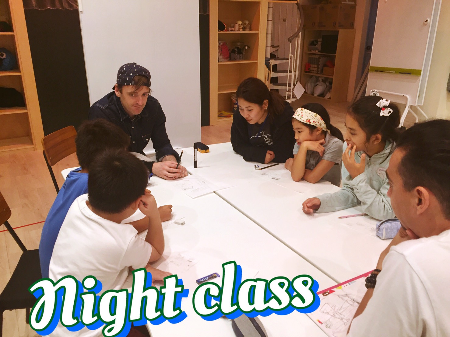ナイトコースではまず絵を描いてもらい、その絵を使って1、ストーリーを自分で考える