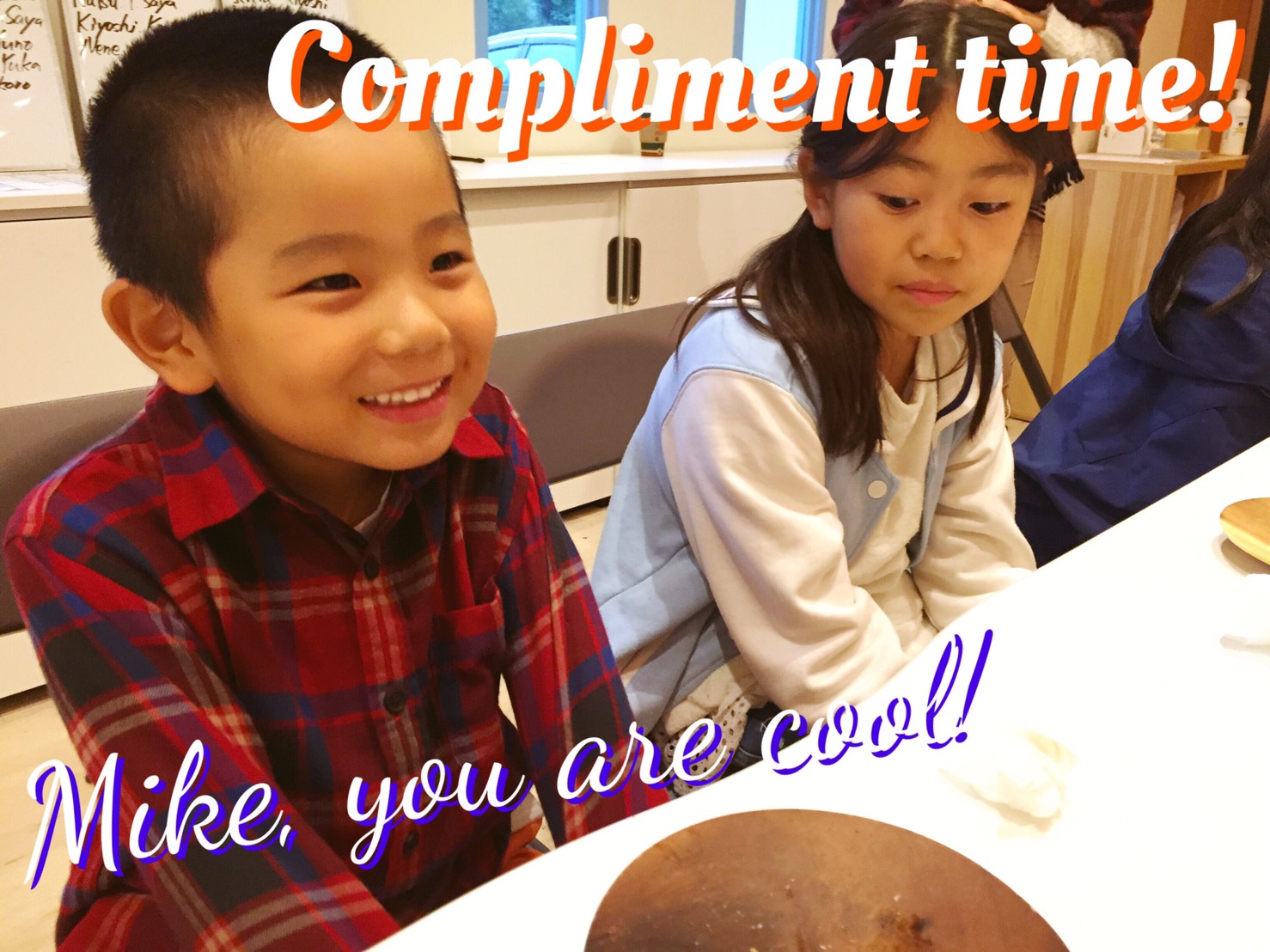先生達と”Let’s exchange compliments.”(お互いに褒め合おう)