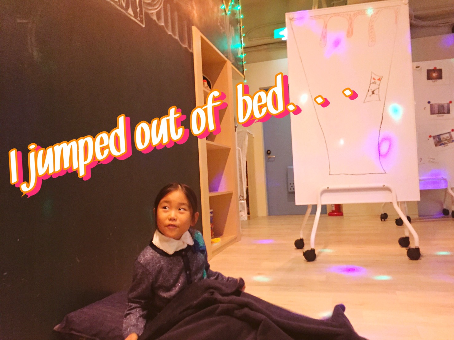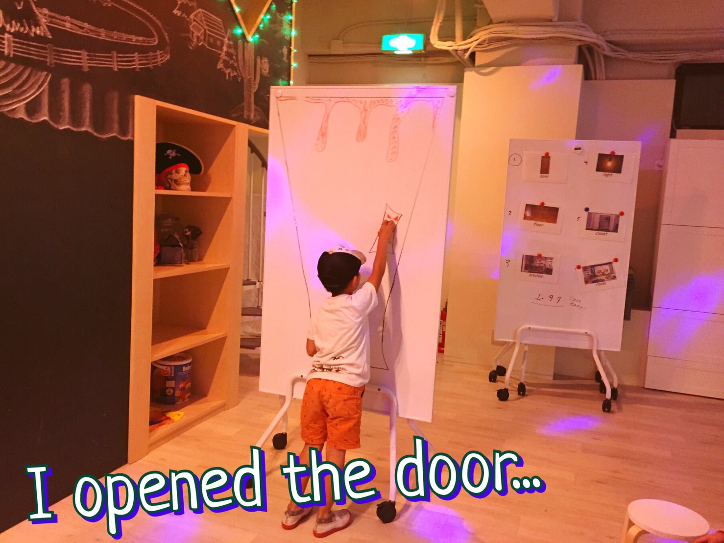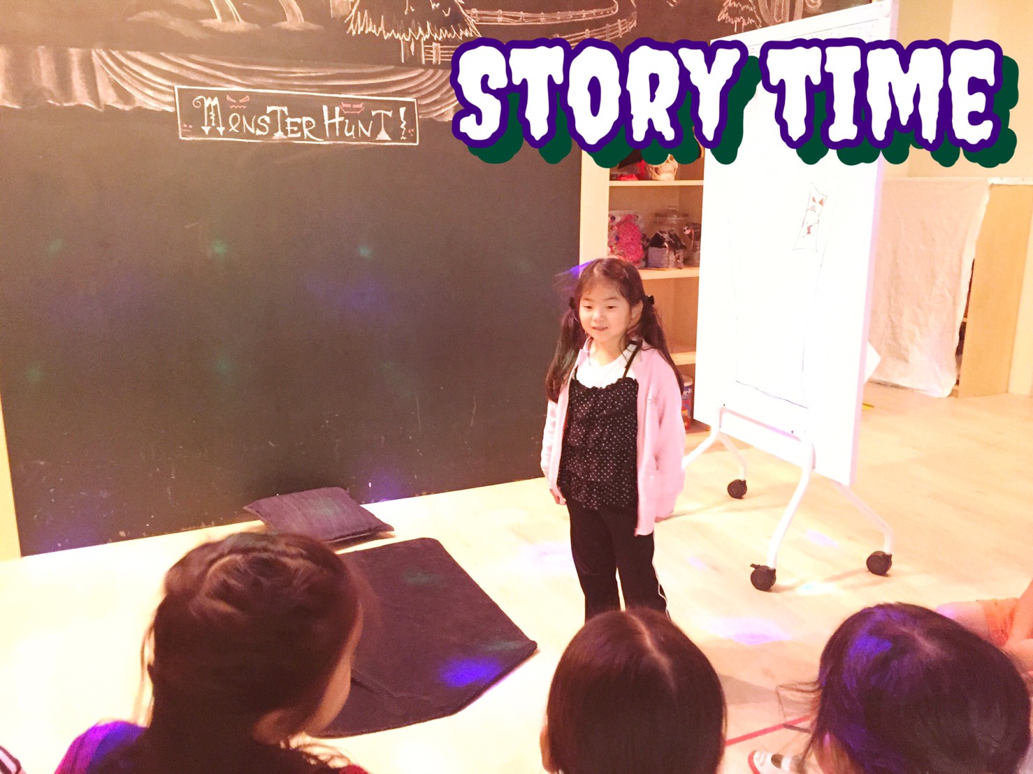 ストーリータイムでは、スピーカーから流れる英語の物語にそって、それを「聞き分け」て「演じる」練習。