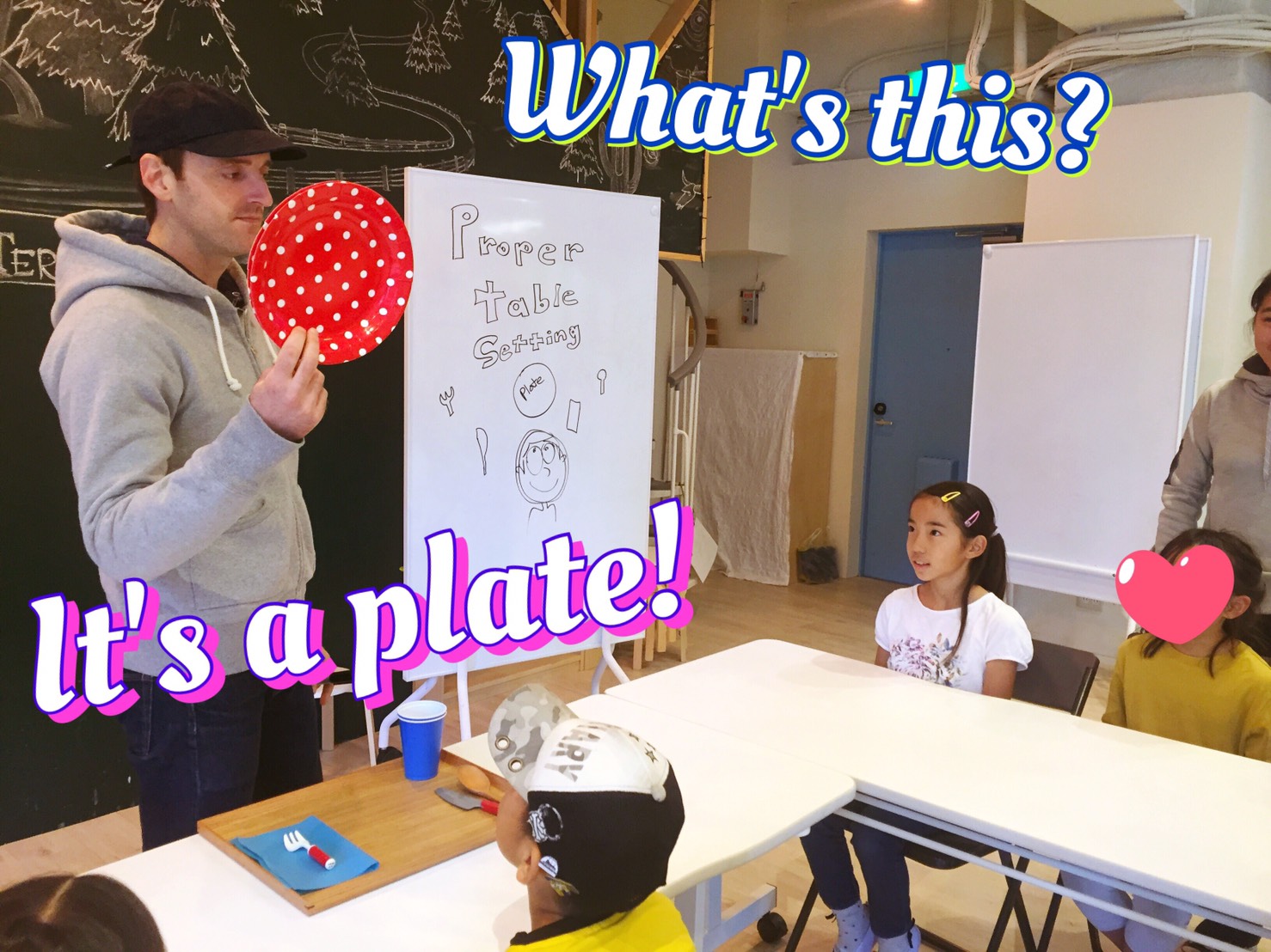 今日の”Workshop time”(ワークショップの時間)は”Cooking”(クッキング)で“Proper table setting”(正しい食器の並べ方)をやりました。