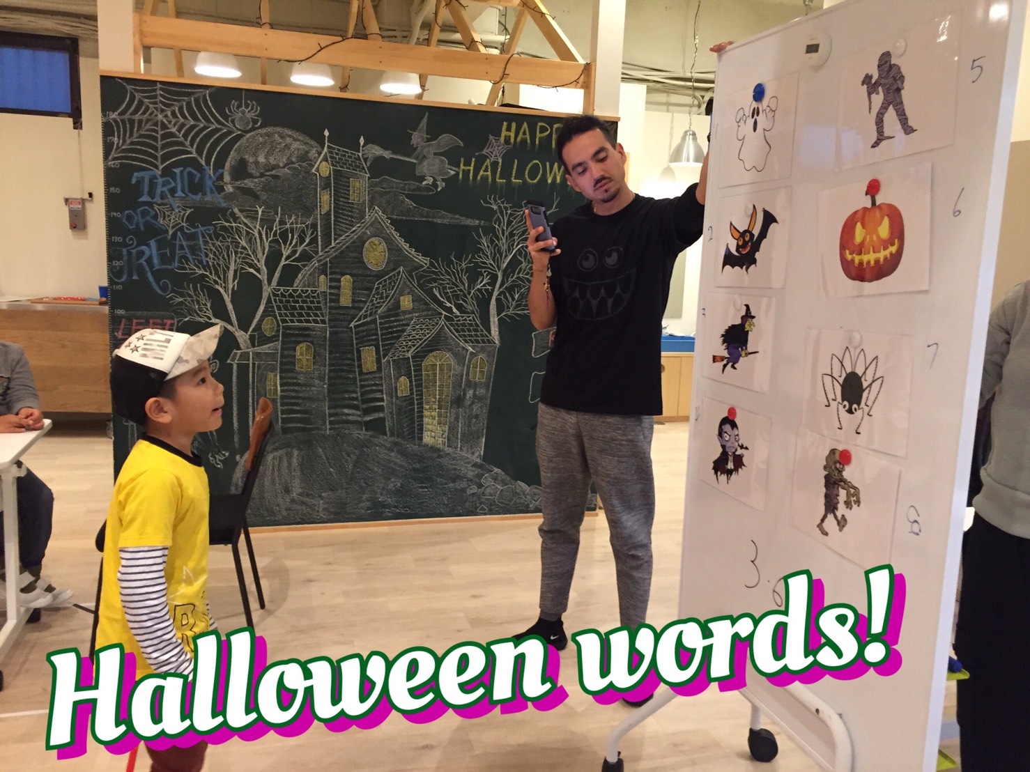 スナックタイムでの単語のスピードチャレンジは、ハロウィンにちなんだワードです。すでにいろんなレッスンででてきた単語もたくさんあるので、すぐに覚えられたかな?