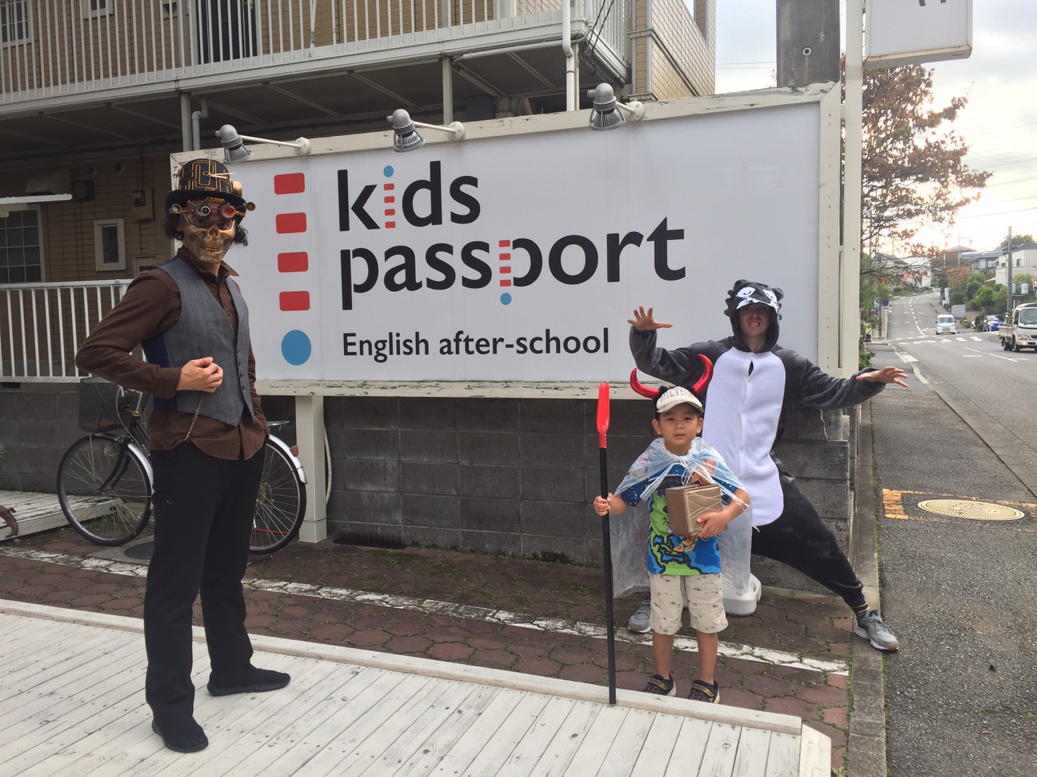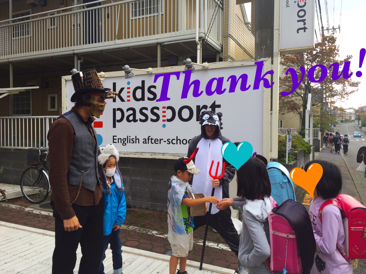 コスチューム持参の生徒さん達はコスチュームに着替えて、持ってきていない生徒さん達はスクールのアイテムを身に付けてみんなで外に出て道行く人に”Happy Halloween!!”(ハッピー・ハロウィン)と声を掛けてキャンディーを手渡しました。