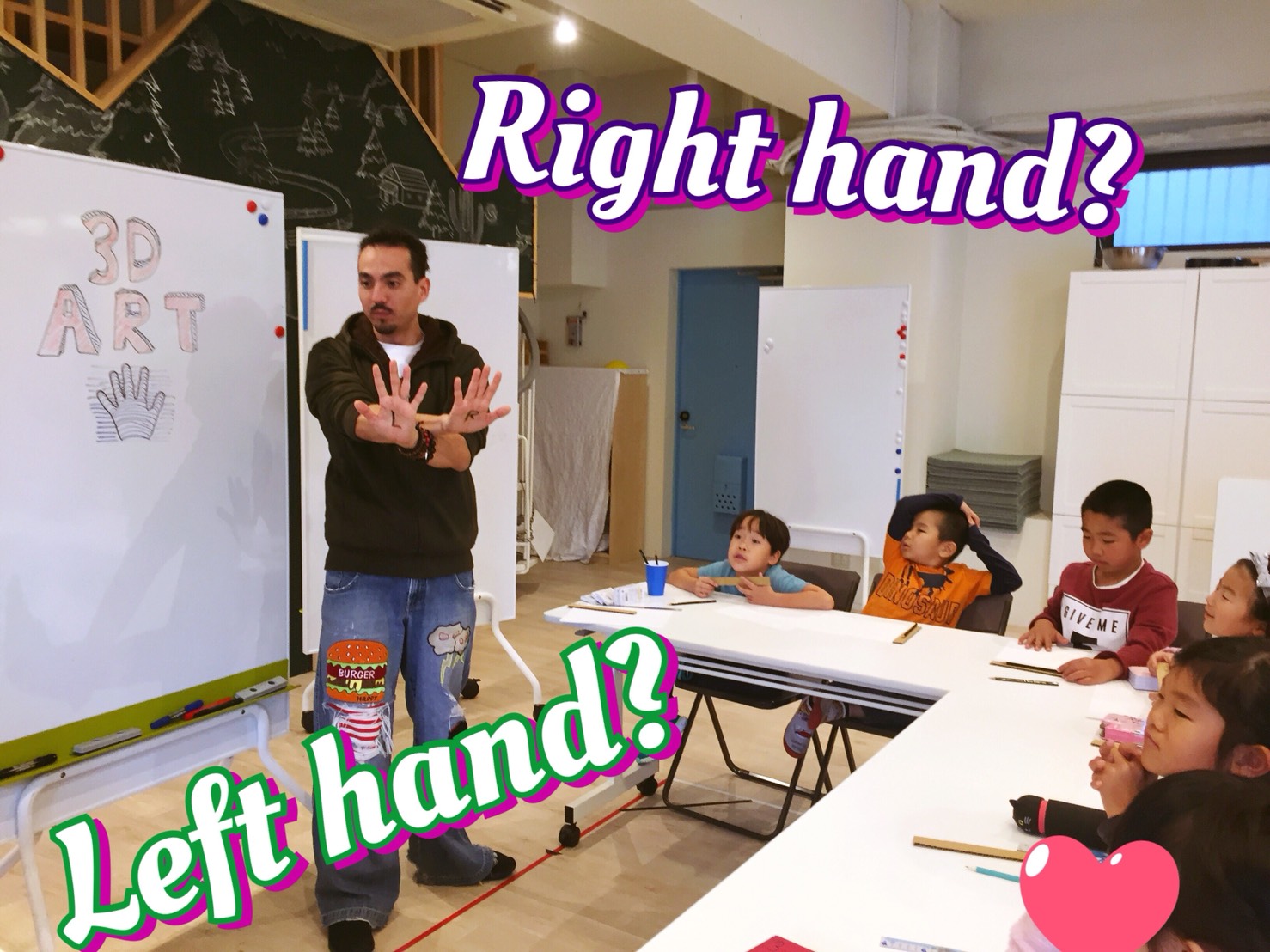 先生:“Is this my right hand or left hand?”(これは先生の右手かな?それとも左手?)