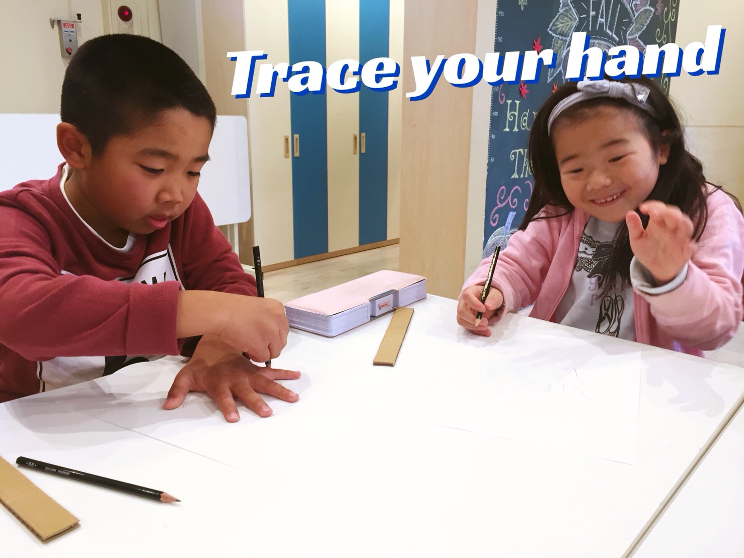 (正解。紙に手をこうやって置いて、えんぴつでなぞって)