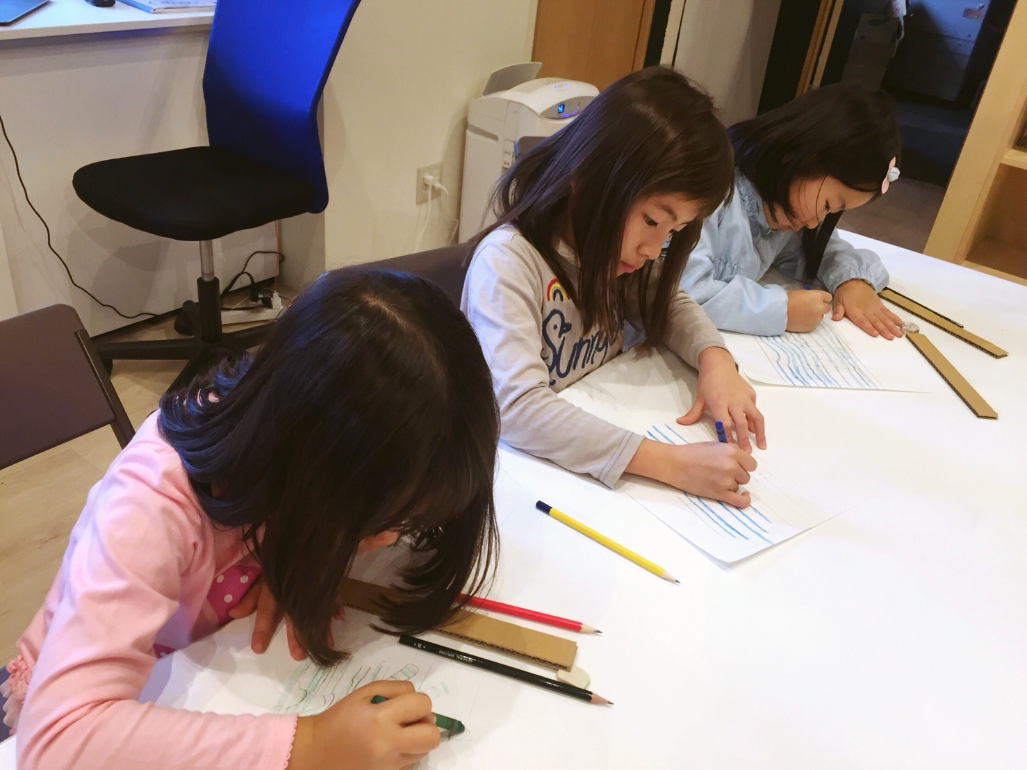 紙、えんぴつ、消しゴムを配られて、それぞれの名称や”Target language”(覚えて欲しい単語)の練習をして、”3D art”(3Dアート)をやりました。