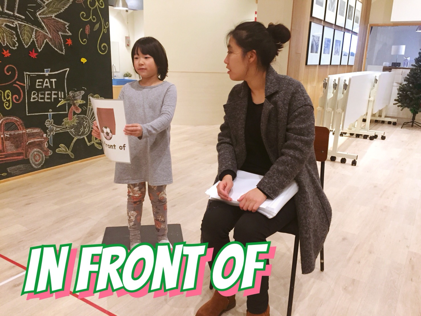 生徒さん:James is in front of the box.(ジェームスは箱の前にいます)